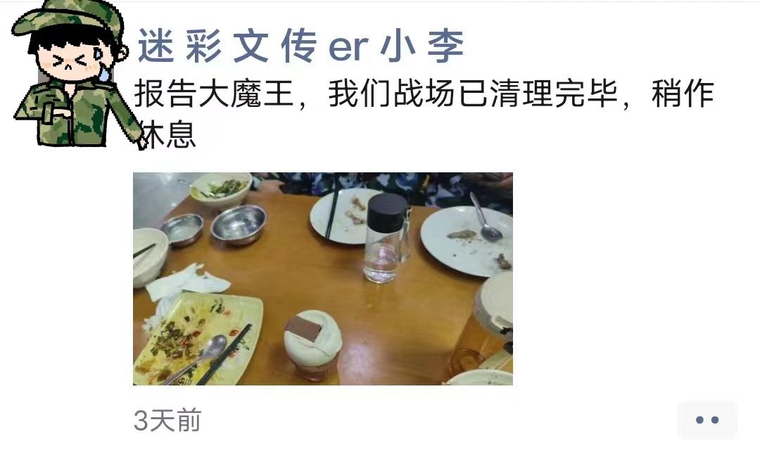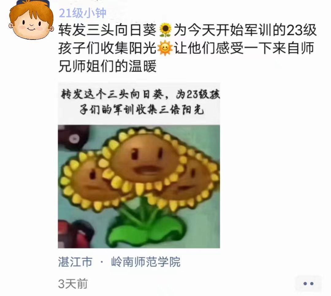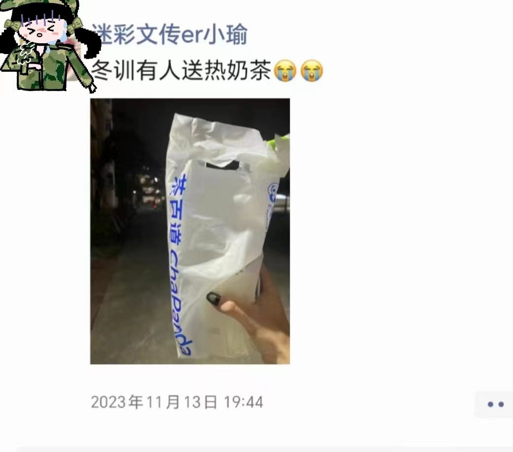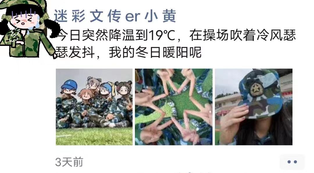 朋友圈总是时刻记录着大家的所见所闻,新生们也在朋友圈里分享了军训的那些事儿,例如:军训开始的第一天就降温变冷,便有新生在朋友圈求太阳;还有新生分享了下训后被迷彩服填满的南门小吃街的图片,据说新生们是怀着“校内抢不过,校外再战”的心情去扫荡小吃街的。除了这些,也有新生分享了很长段的记录着军训的点点滴滴的文字。“驻守”在朋友圈的师兄师姐们表示:“好看,爱看,多发。”