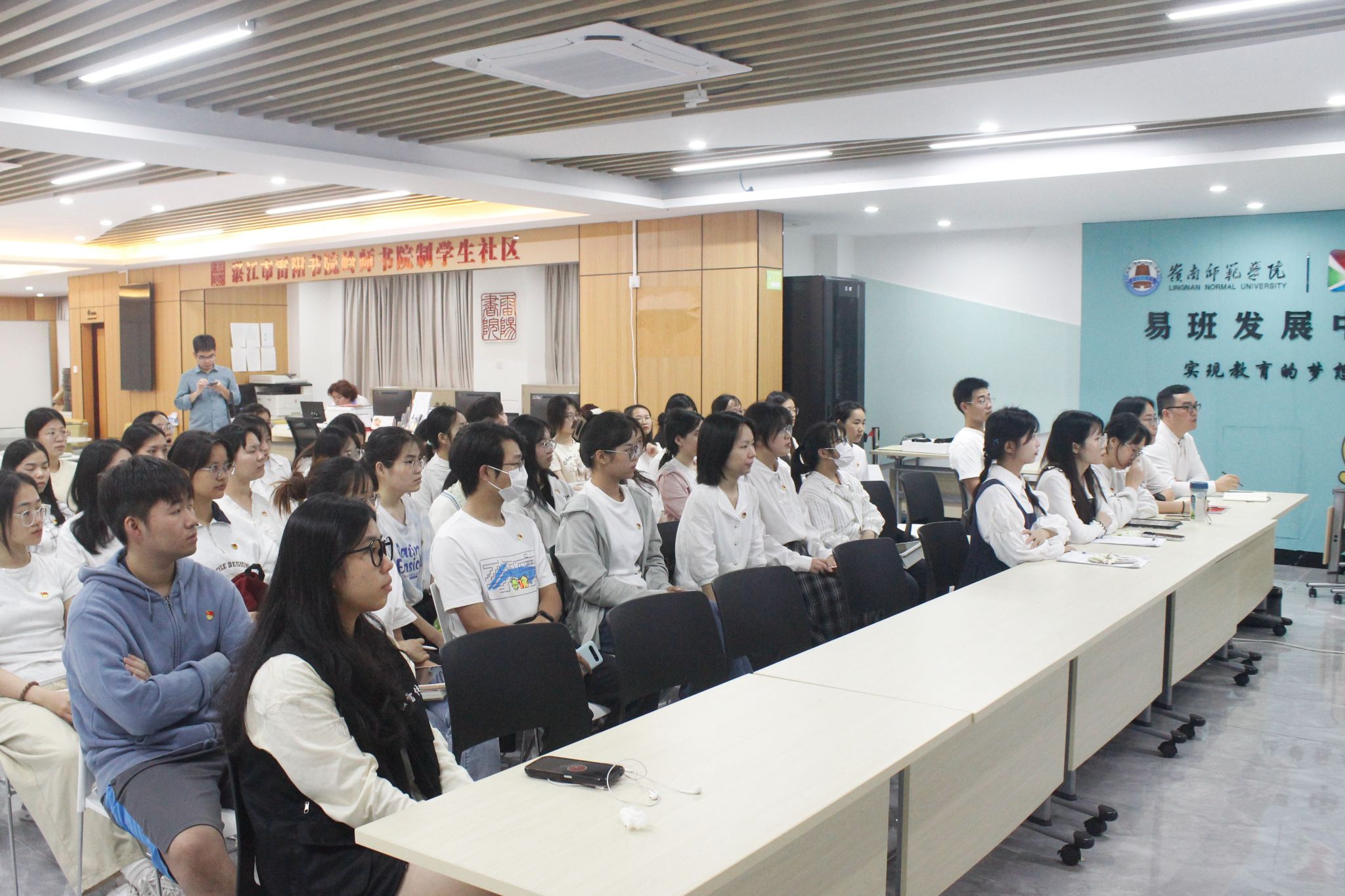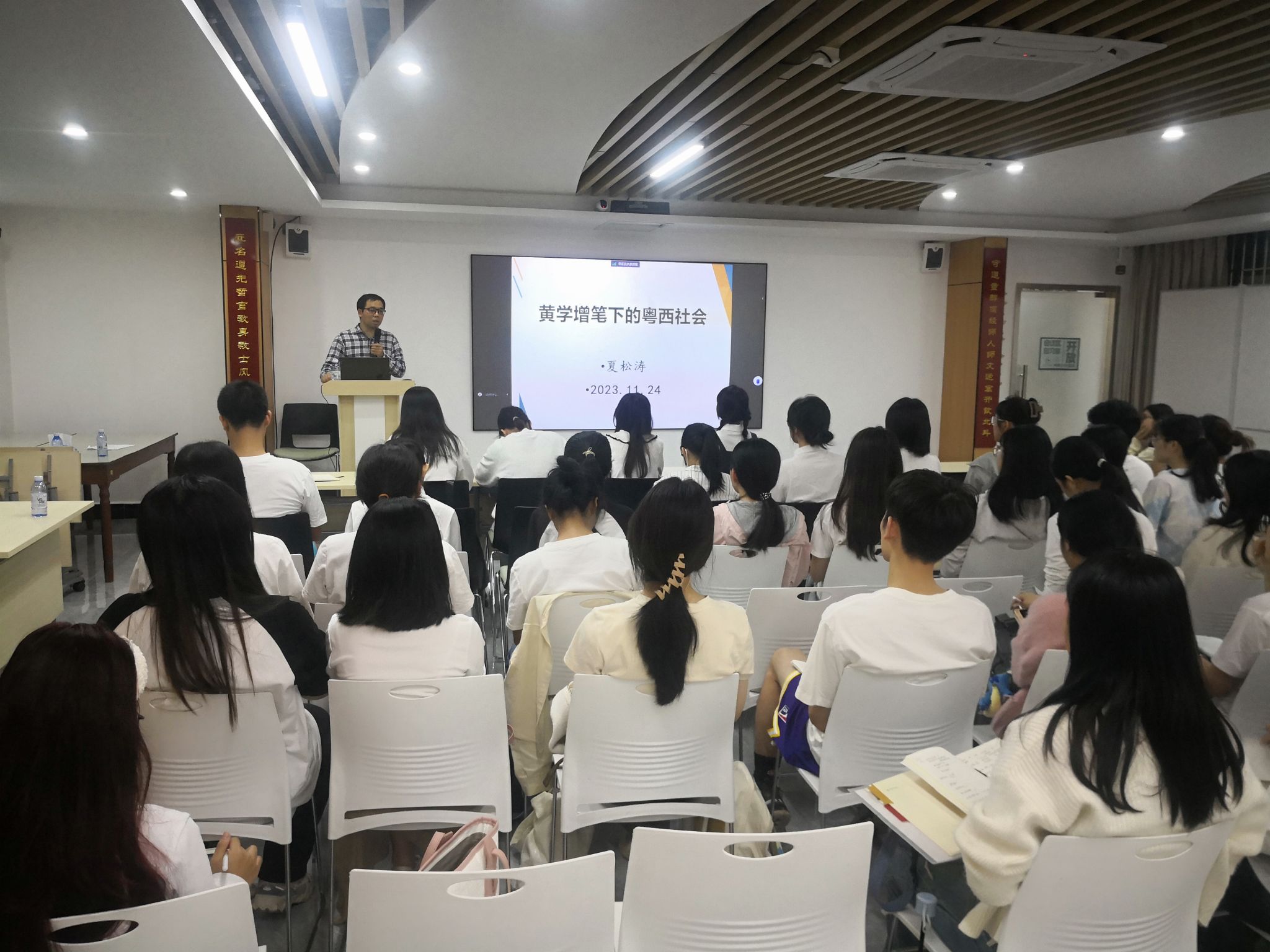11月24日晚,马克思主义学院院长夏松涛在学校一站式学生服务中心带领文学与传媒学院全体学生党员开展主题为《黄学增笔下的粤西社会》的红色读书会,旨在深入贯彻落实党的二十大精神和习近平总书记关于“传承红色基因、赓续红色血脉”“培育时代新人”等重要论述精神,把青年学生读书行动与学习贯彻习近平新时代中国特色社会主义思想主题教育紧密结合起来,先行探索办好红色读书会,深入学习习近平新时代中国特色社会主义思想,赓续红色血脉,培养德智体美劳全面发展的社会主义建设者和接班人。