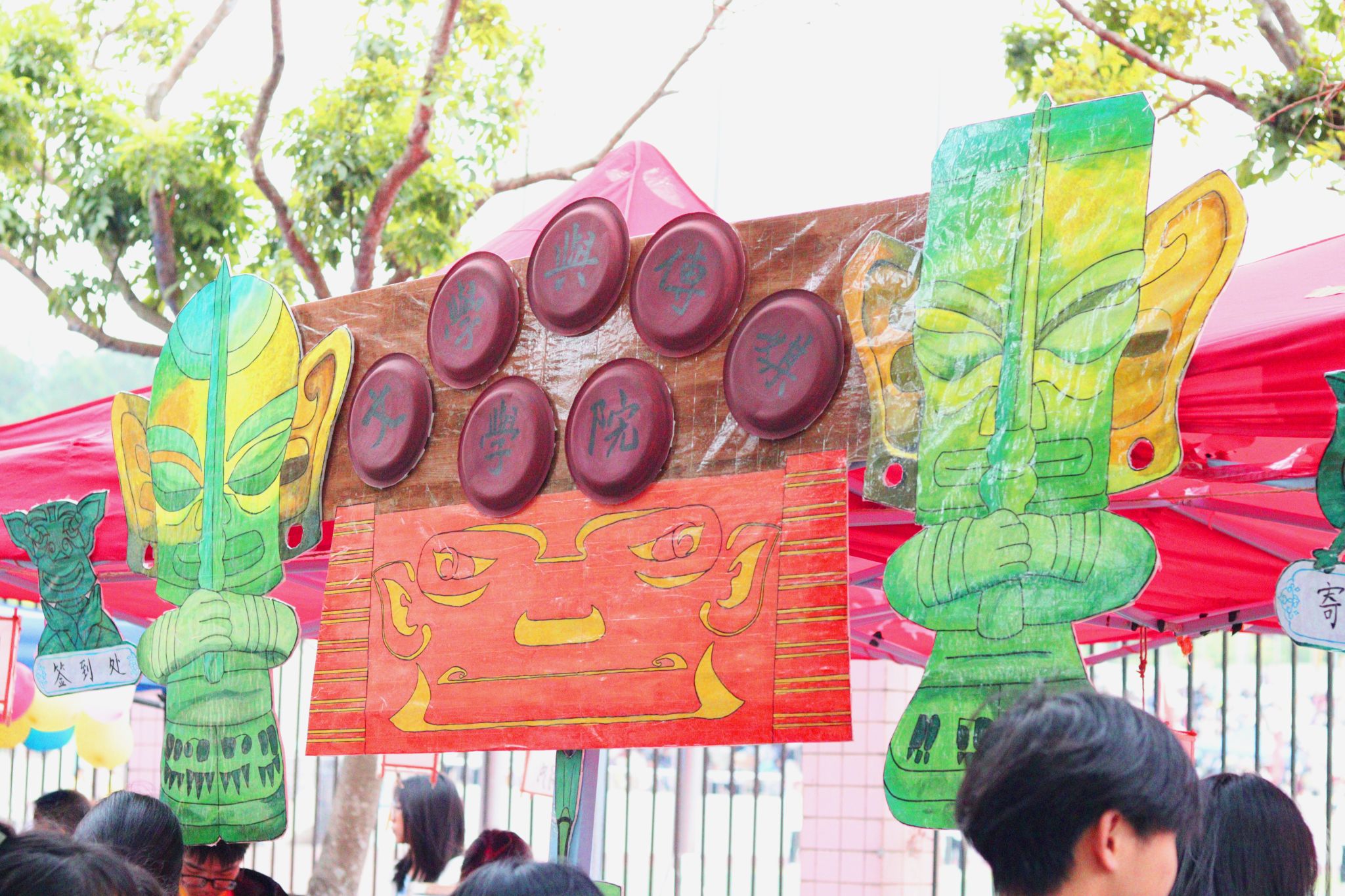 在本次校运会中,文传大本营的设计主要是以三星堆文物以及古蜀传统文化为主要元素。美工部人员把青铜人首、铜巨型神兽、青铜大面具等等这些三星堆元素融入到龙虎榜等牌匾之中,尽显三星堆文化之璀璨。当然,现场也不仅仅只有三星堆元素。在古色古香的屋檐前,写有三字经的贝壳串链泠泠作响,两侧纸糊灯笼中的谪仙仿佛要随着轻风破纸而出。正所谓,中华优秀传统文化博大精深、源远流长。据记者了解,以三星堆文物为主要元素来设计的初衷在于,三星堆的继承和发展之路就像我们文学与传媒学院的发展之路一样,在继承深厚历史传统的基础上致力于创新与进步,始终焕发着新的生机和活力。