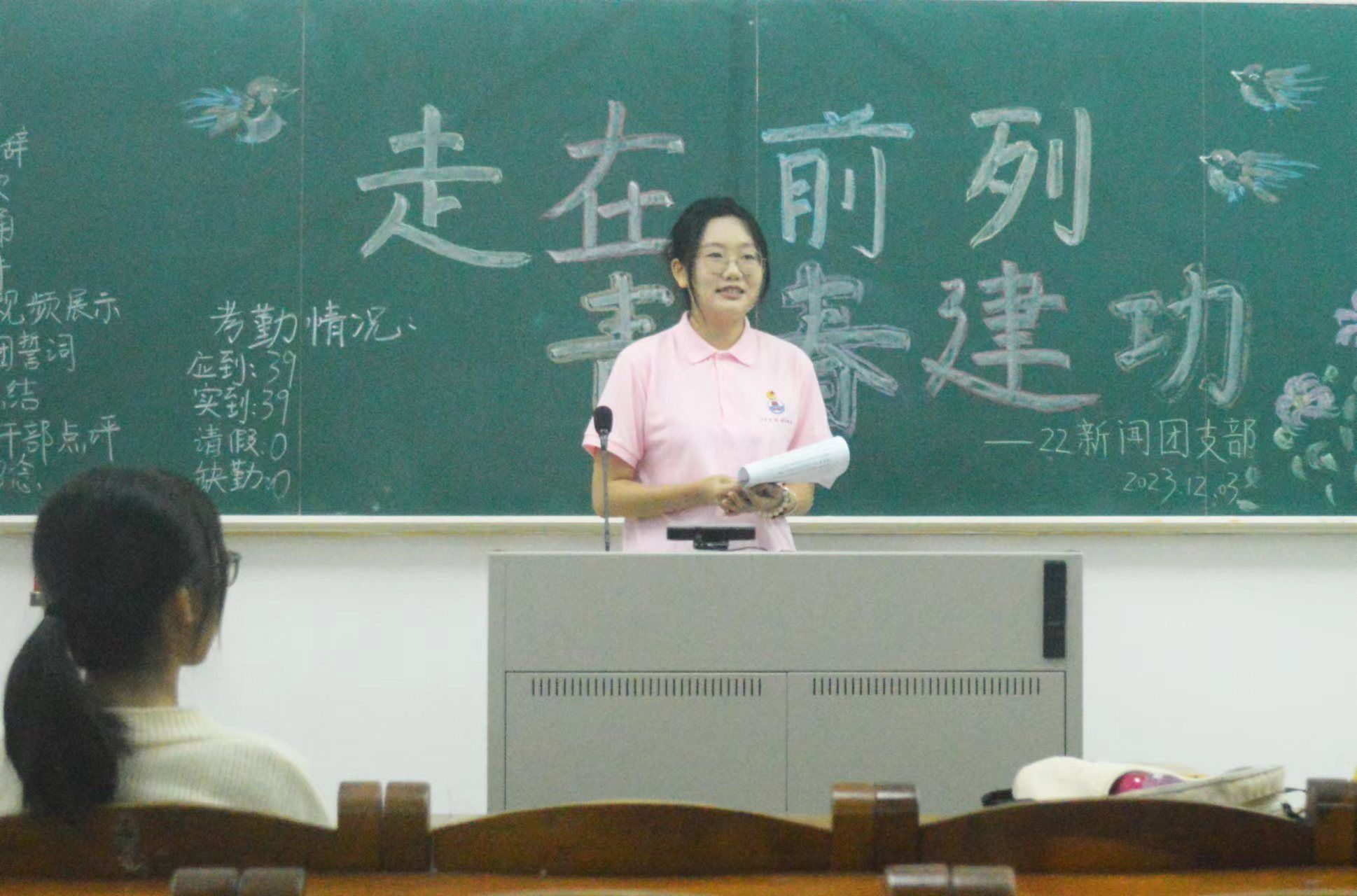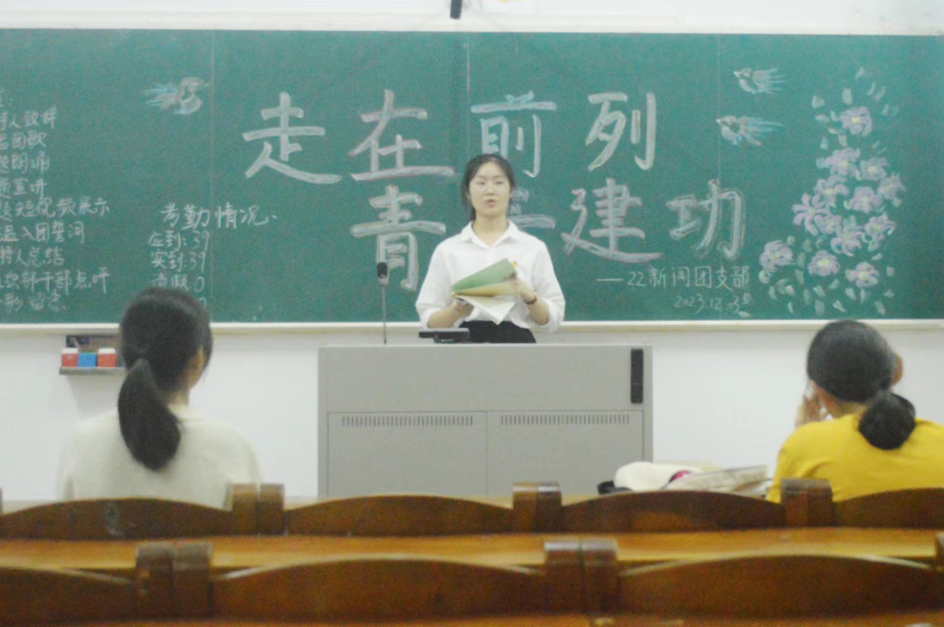 为了增强团组织的凝聚力,全面贯彻党的二十大精神,12月3日,22级新闻学班团支部在第三教学楼108教室举办了主题为“走在前列,青春建功”团日活动暨“当代少年生逢其时,重任在肩”主题宣讲。22级新闻学班全体同学和文学与传媒学院相关干部出席本次活动。