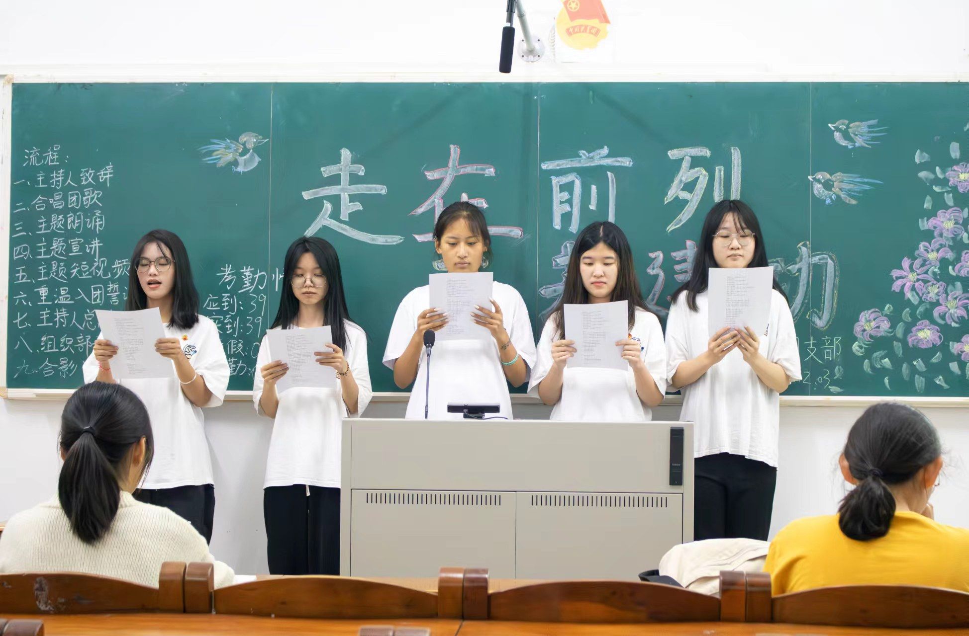 声音传递力量,语言鼓舞人心。本次活动在同学们的团歌声中拉开序幕,团歌的伴奏响起,所有同学都神情肃穆、眼神坚定,同学们嘹亮的歌声响彻了整个教室。“我们是五月的花海,用青春拥抱时代;我们是初升的太阳,用生命点燃未来……”团歌中饱含先辈对共青团员们的期许。当代青年应时刻牢记使命,立大志、明大德、成大才、担大任。为丰富团日活动内容,增添团学趣味,22级新闻学班还组织了相关主题朗诵。同学们为此次朗诵做了充足的准备,呈现形式多样,语调整齐一致,话语铿锵有力。