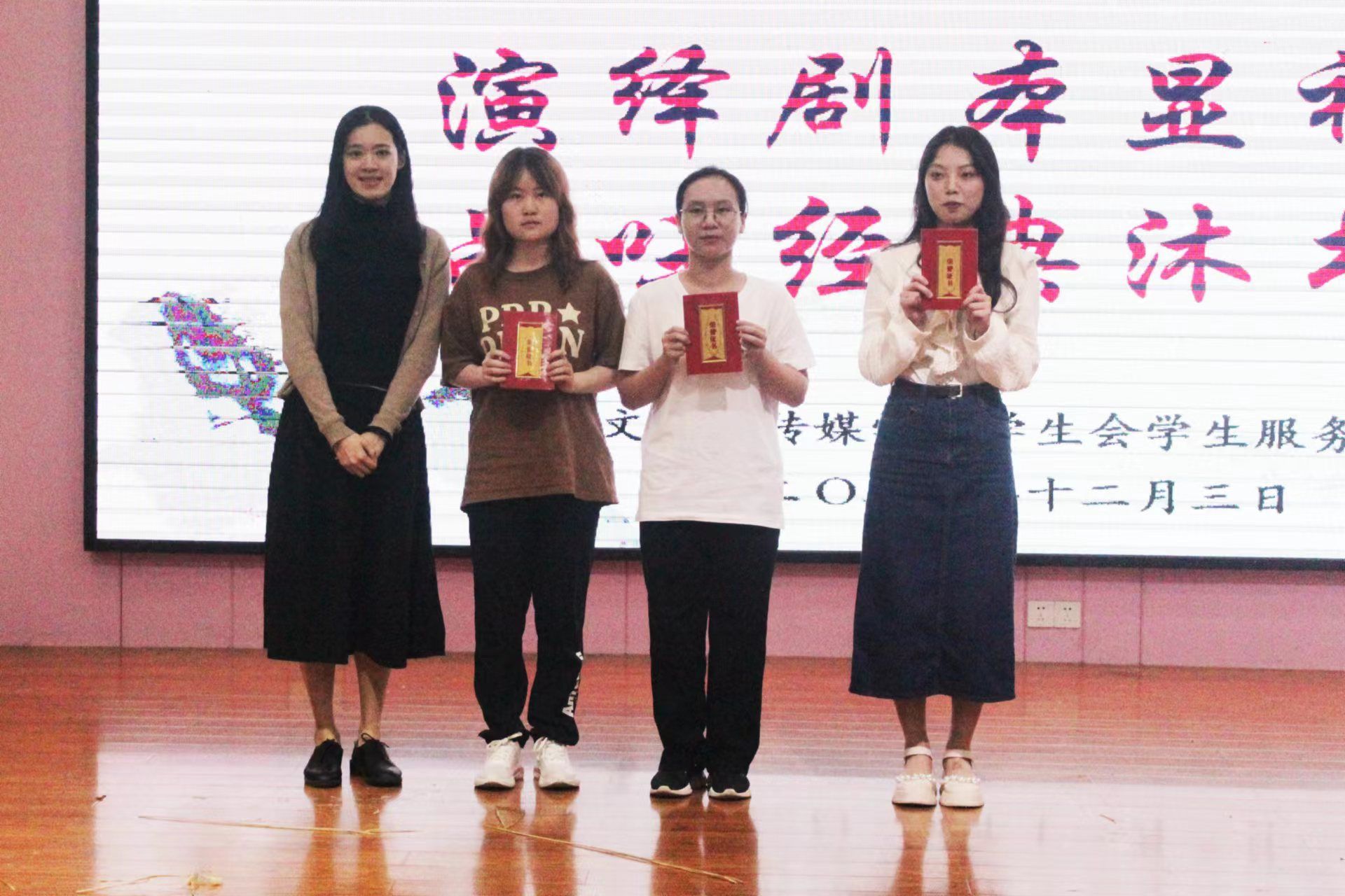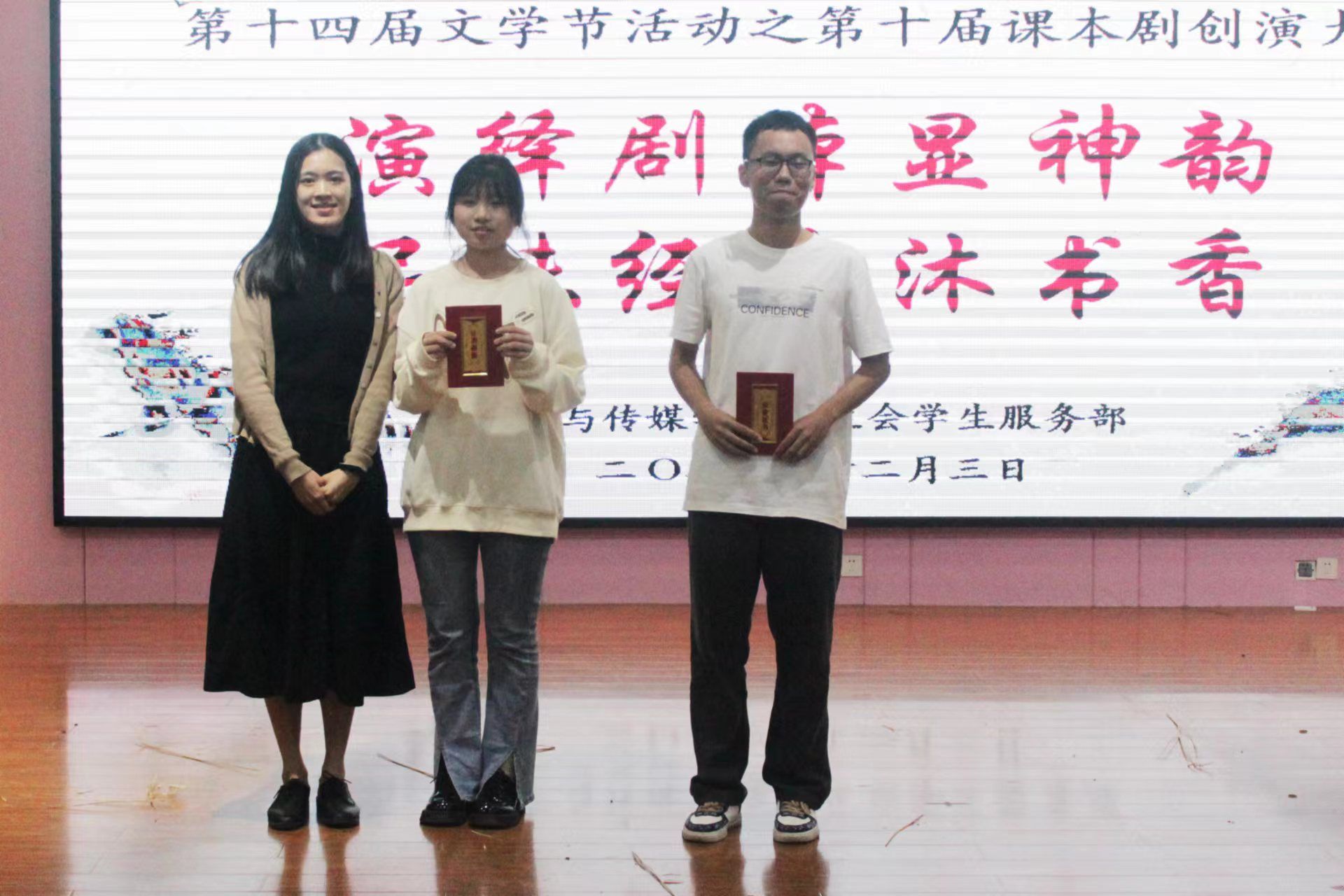 经现场评委评分,评委和嘉宾们投票,最终获奖名单已出炉。《氓》(新编-淇水汤汤)剧组获得一等奖,《为中华之崛起而读书》和《鸿门宴》剧组获得二等奖,《花木兰》《百合花》和《金色的鱼钩新编》剧组获得三等奖,《驹白了忱》和《孔乙己(改编)》获得优秀奖。与此同时,《百合花》剧组的钟滢同学凭借出色的演技和扎实的台词功底最终荣获“最佳演员奖”。