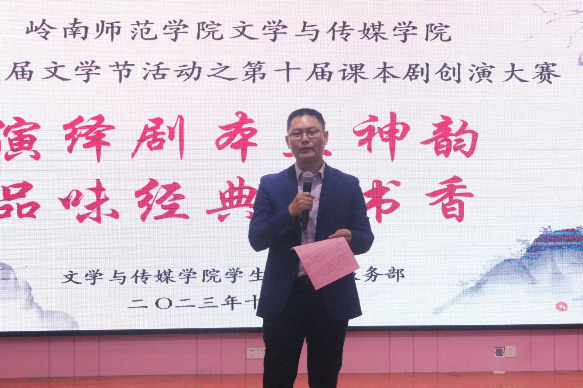 传承经典,演绎经典。为提高学生对课文的研读能力,感受文本的艺术魅力,让经典在当代迸发出新的活力,岭南师范学院第十届课本剧创演大赛决赛于12月3日晚在第三教学楼311教室举行,本次以“演绎剧本显神韵,品味经典沐书香”为主题的活动由岭南师范学院文学与传媒学院学生会承办。