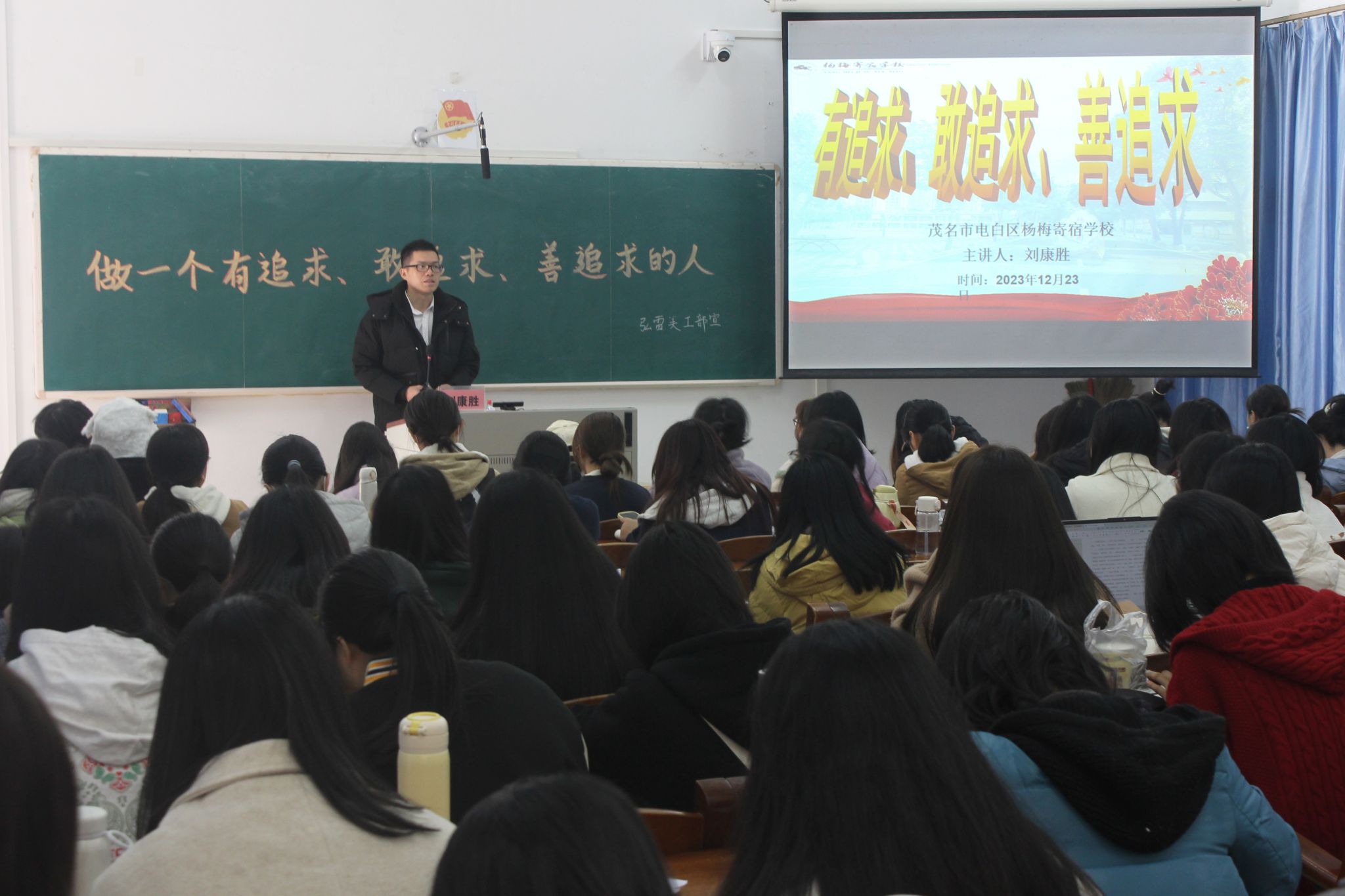 为了更好地促进2024届毕业生高质量就业,帮助毕业生拓宽就业渠道,12月23日上午,文学与传媒学院在第三教学楼108室举办了主题为“做一个有追求、敢追求、善追求的人”的讲座,荣幸邀请了岭南师范学院2013届汉语言文学专业毕业校友、茂名市电白区杨梅寄宿学校校长刘康胜作为主讲人。在讲座中,刘康胜向文传学子分享了他一路走来所积累的经验并宣讲茂名市电白区杨梅寄宿学校。