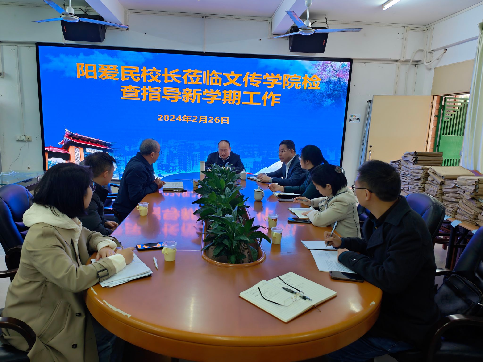 2月26日是我校春季开学第一天,上午10时许,阳爱民校长便莅临文学与传媒学院检查指导工作,并与学院班子进行了座谈。他先是到教三检查文传学院开学上课情况,巡视了部分教室,了解老师、学生的课堂状态,随后到学院会议室与班子成员进行座谈,深入了解学院的发展规划和实际困难。