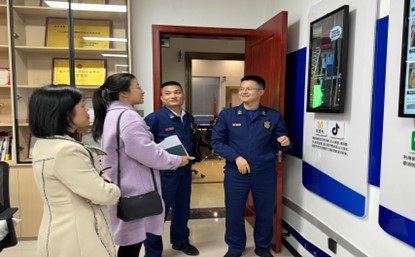 在随后的参观环节,韩彬副支队长重点介绍了消防支队的媒体宣传工作,包括硬件设施、多平台账号运营以及与央级媒体的紧密合作等。他强调,消防支队能够第一时间获取新闻素材,这些丰富的素材为学生提供了广阔的创作空间,学生可以自主从中挖掘、采写,充分锻炼新闻采编能力。在韩彬副支队长等人的带领下,陈书记一行逐一参观了全媒体中心演播室、录音室、消防员之家、消防演练区等处,深入体验并了解消防支队的内部环境及全媒体中心的新媒体传播方式。