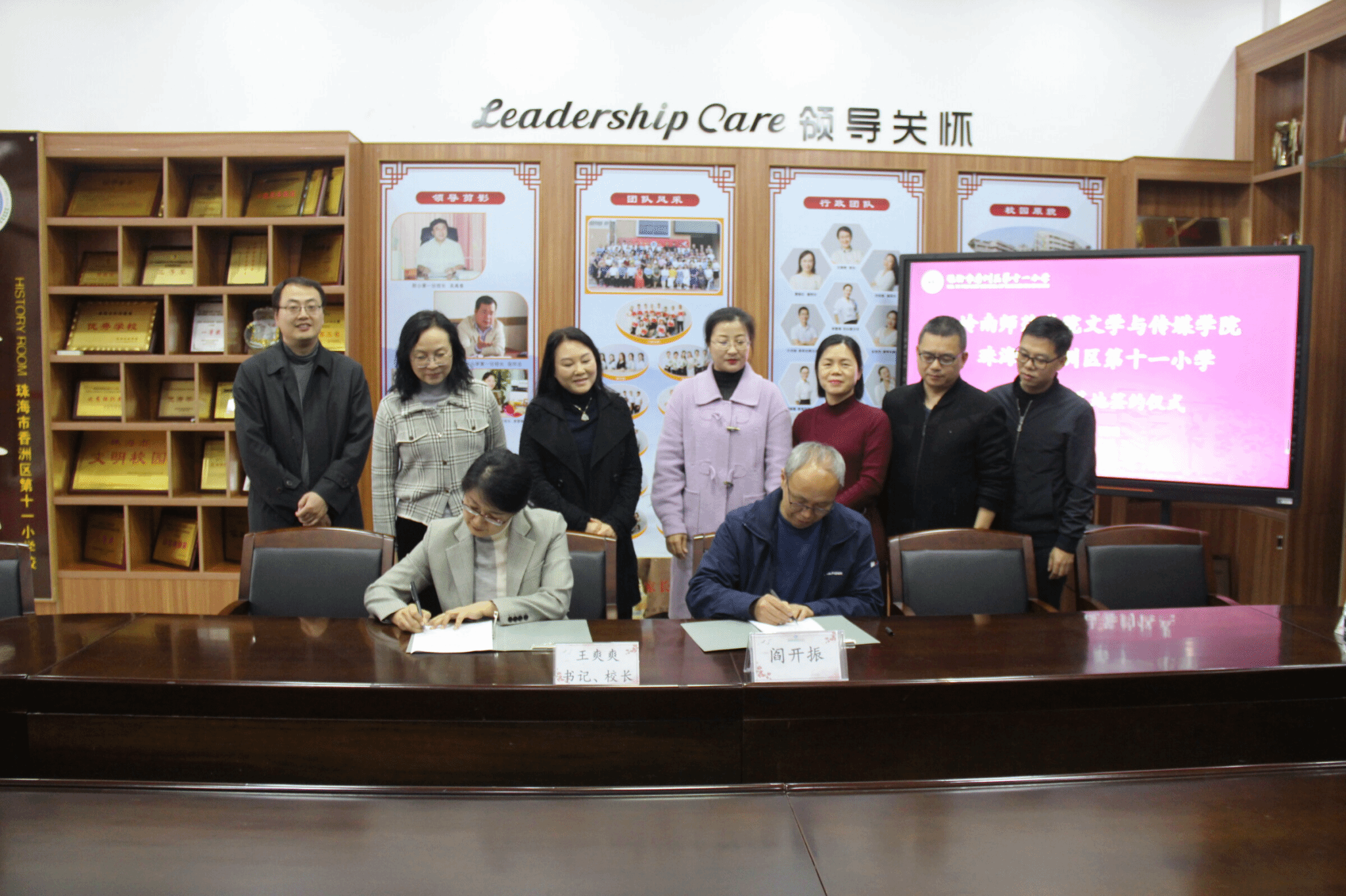 珠海市香洲区第十一小学创建于1996年,秉承着“以人为本,和谐发展,为学生的一生奠基”的办学理念,以办人民满意的学校为宗旨,大力改善办学条件,全面提高教师素质,积极实行“阳光工程”,实现了学生全面发展、教师专业发展、学校和谐发展。挂牌仪式上,文学与传媒学院院长阎开振发表致辞,他强调了学院与地方学校建立紧密合作关系的重要性,并表示此次签约挂牌利于双方实现优势互补与资源共享,而这也是共同探索人才培养新模式、推动教育事业发展的重要一步。