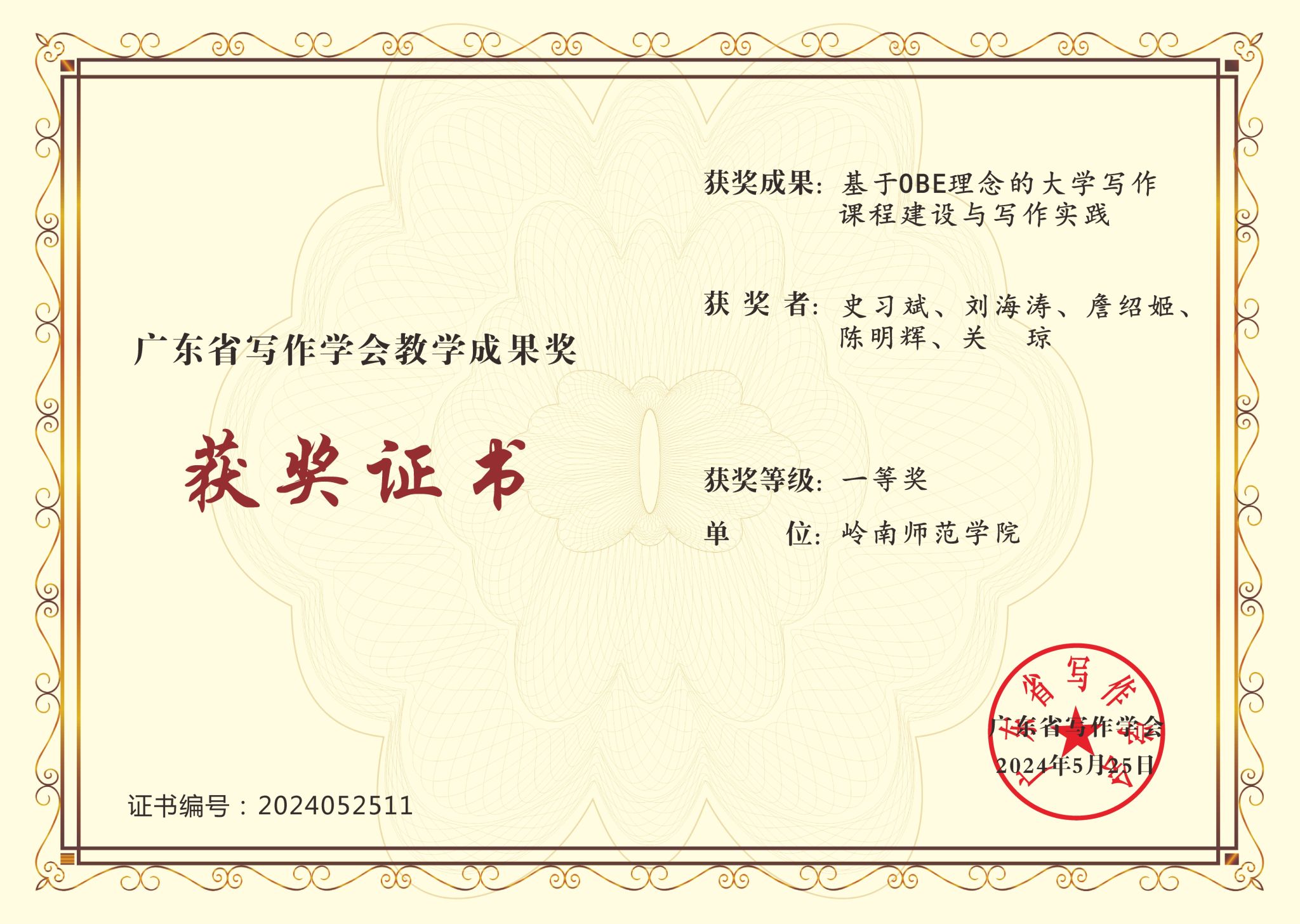 此次大会公布了教学成果奖评选结果,我校写作团队提交的“基于OBE理念的大学写作课程建设与写作实践”获得广东省写作学会首届教学成果奖一等奖。