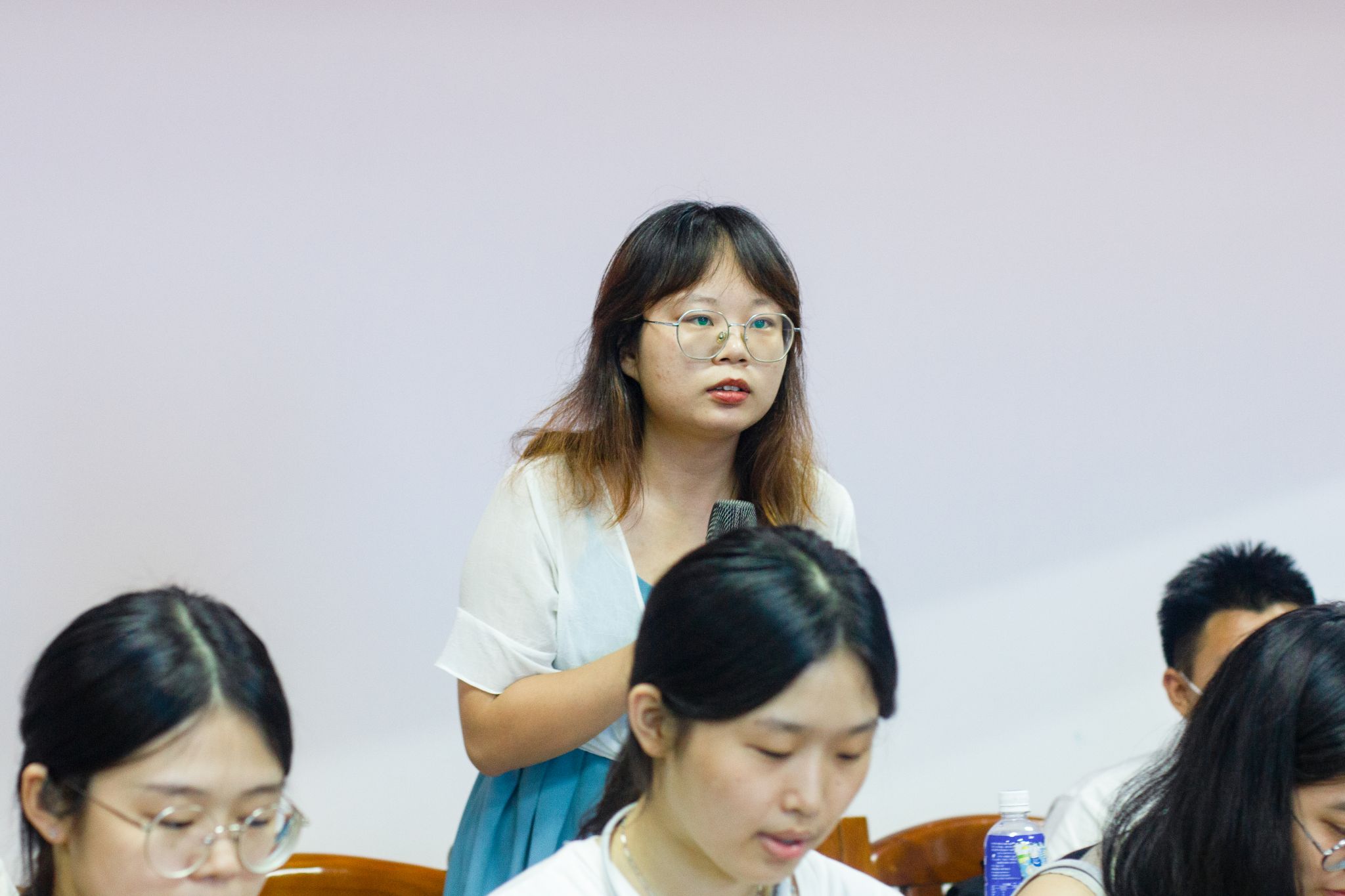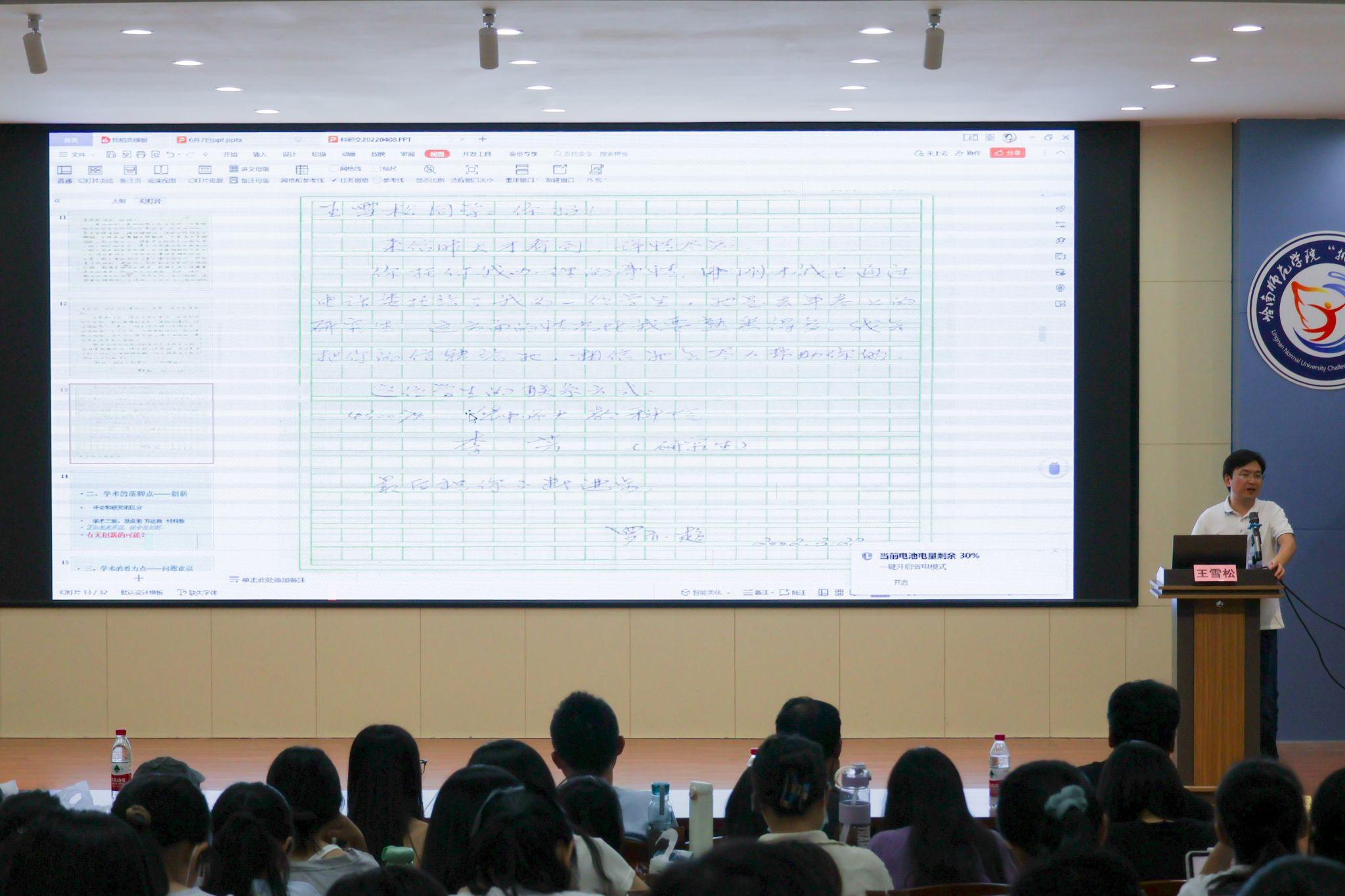 王雪松接着分享了自己的治学经验。学问可以“顺着讲”“接着讲”“反着讲”,这是发现问题、研究问题、解决问题的三种常用方法。他告诉学子们要通过比较不同的学术作品,发现思维的差异,从对作品形式的追问上升到对内容、意义的追寻。他强调要学会“是什么”“为什么”“怎么办”三种思维方法。