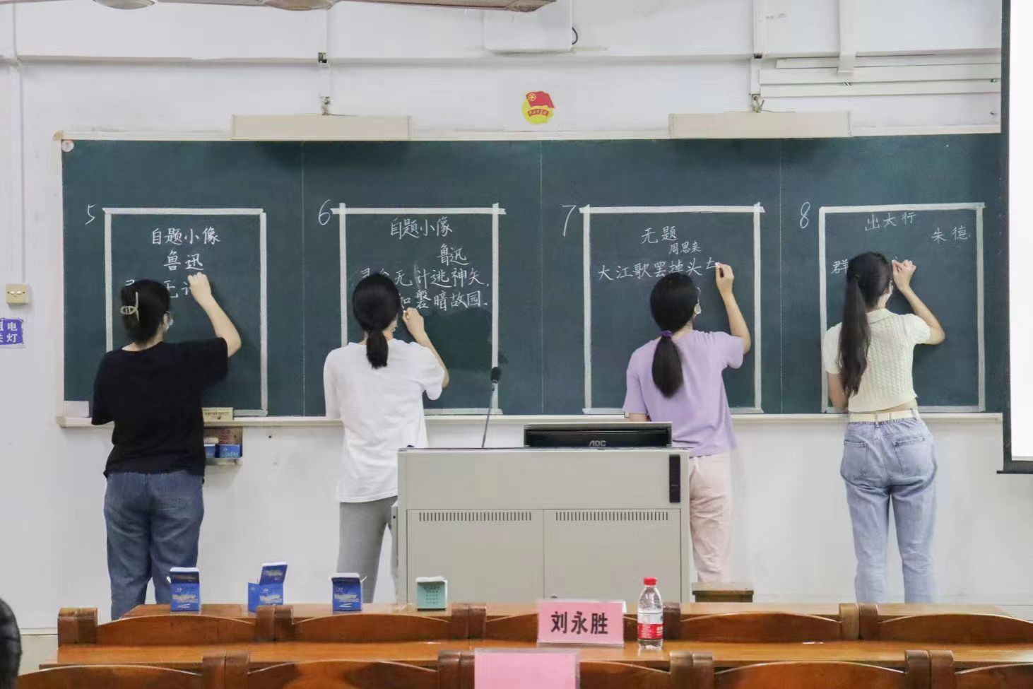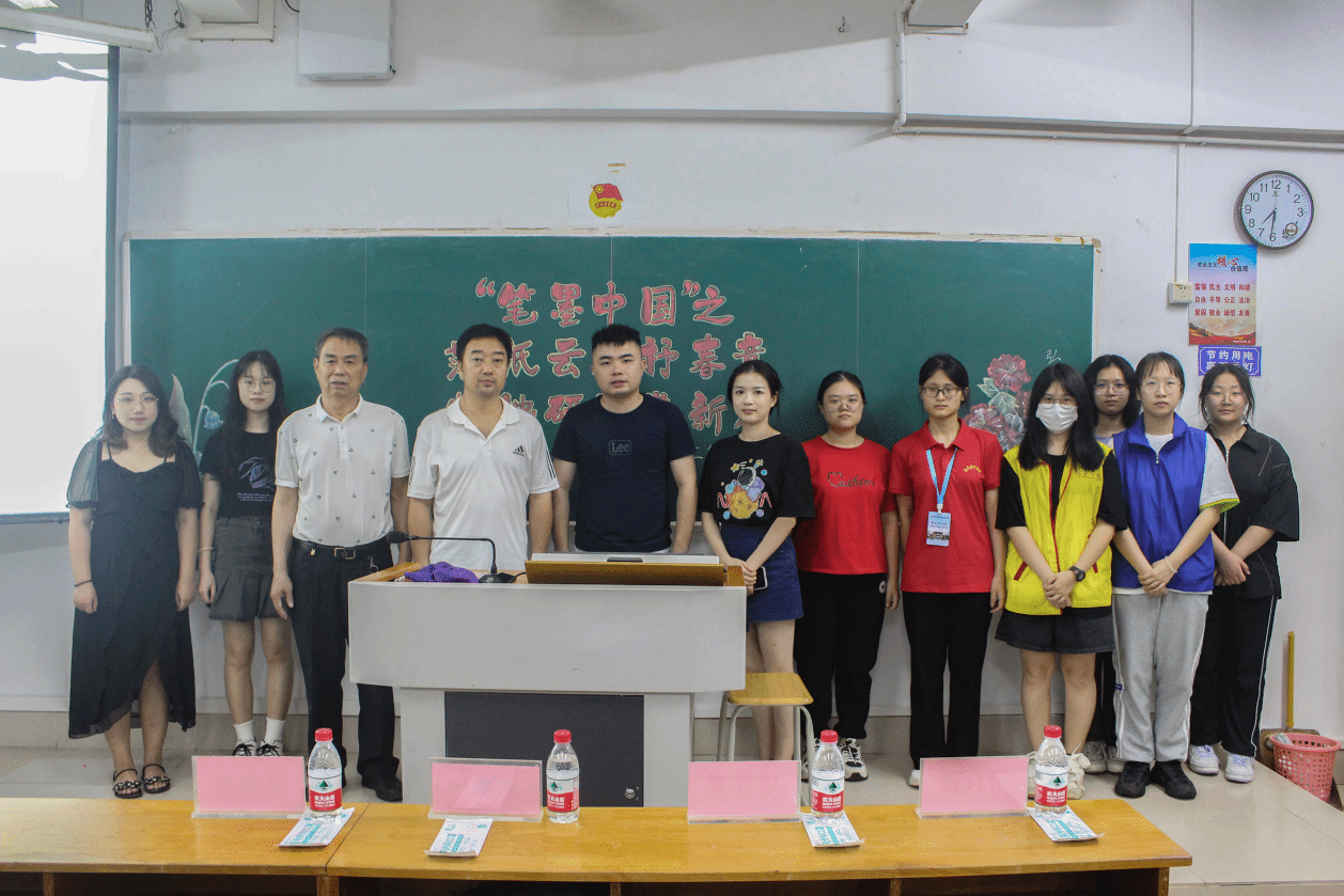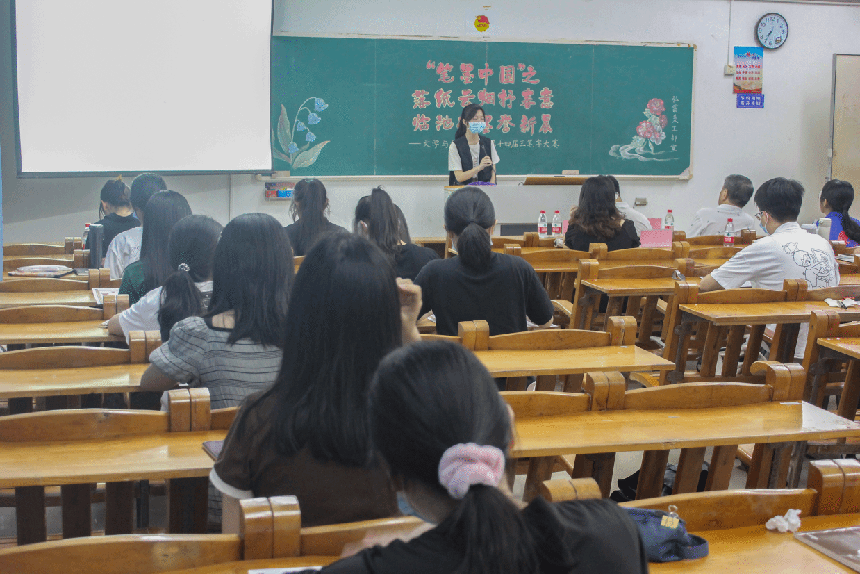 黑板上书写的“‘笔墨中国’之落纸云烟抒春意,临池研磨誉新晨”与萦绕满室的悠韵墨香让比赛现场的书法文化氛围愈加浓厚。在开幕仪式上,主持人林淑珍向大家隆重介绍了莅临本次比赛嘉宾。接着,她向大家介绍了本次比赛的规则以及注意事项,待各位嘉宾和老师上台合影留念后,毛笔组、粉笔组和硬笔组的评委老师和参赛选手移步到相应的比赛场地进行比赛。本次比赛采用线下形式,不仅考察了参赛选手书法水平,也考验了选手们临场反应能力。比赛现场,工作人员有序组织,严格按照学院有关比赛的要求,助力比赛顺利举办。