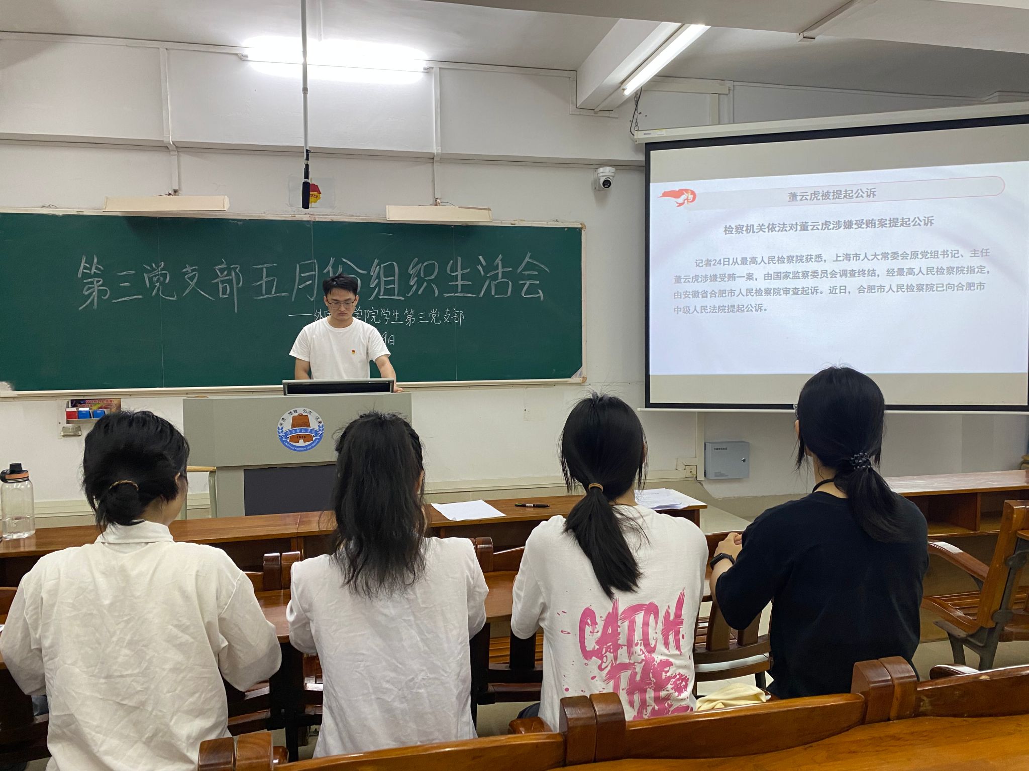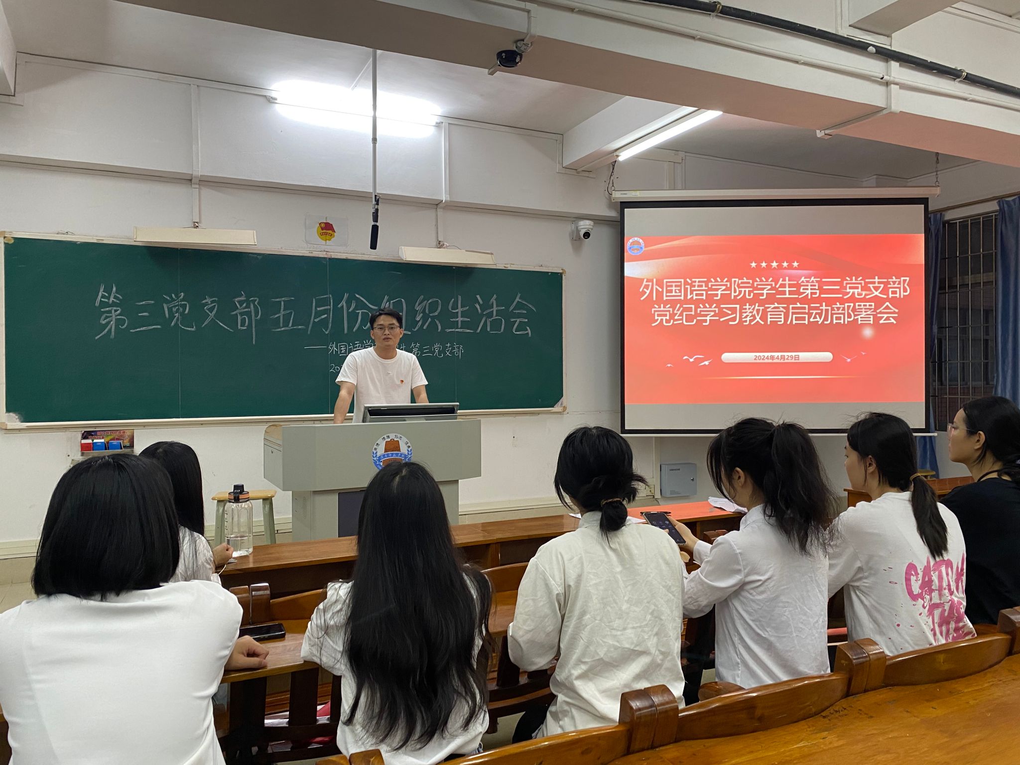 4月29日,外国语学院学生第三党支部于教三405召开党纪学习教育学习会,党支部书记陈秋湛主持会议,学生党员、发展对象和积极分子等参会。
