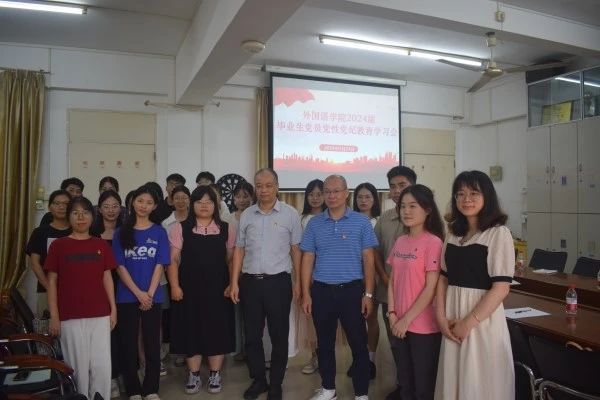 5月24日下午,外国语学院党委于教3-411组织开展2024届毕业生党性党风党纪学习教育专题学会议。参会人员有外国语学院党委书记陈永国、党委副书记杨建伟、学生第一党支部书记黄子琦老师、学生第二党支部书记黄日新老师、学生第三党支部书记陈秋湛老师以及2024届在校毕业生党员。