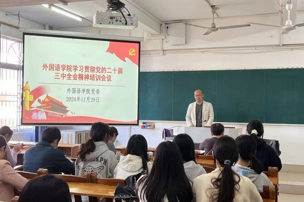 2024年11月29日下午3时,外国语学院党委于第三教学楼606室成功举办了关于学习贯彻党的二十届三中全会精神的培训会议,外国语学院全体教职员工和学生党员参与。