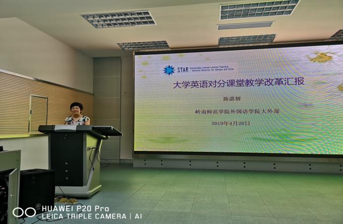 在认真实施对分教学的同时,陈湛妍同志还积极推广对分教学模式,为促进教学改革多做贡献。2015年12月,华南地区对分教学研讨会在我校举行,陈湛妍老师以“营造美美与共高效课堂”为题做大会的主题发言,介绍了我校大外部实践对分的效果和特点。联合外国语学院大外部的多位老师以及另外4所高校的7位老师共同撰写了由对分课堂的创始人——复旦大学心理系博导张学新教授为主编的对分课堂教学手册系列丛书之一——《对分课堂之大学英语》,为全国本科院校的大学英语教师提供对分教学指引。本书已于2017年5月由科学出版社出版。作为该书的第一作者和主要负责人,陈湛妍同志完成了部分章节的撰写、组稿和后期的审阅和修改等大量的工作。该指南书的出版为大学英语的教学改革提供积极的方向和指导。2018年10月22日,参加了由外语院屈书杰教授主持的欧盟伊拉斯谟+STAR项目中期会议并在会上做了主题发言,向国内外的专家和学者介绍了对分课堂教学模式的特点。2019年4月,我校成立全国首批对分课堂大学英语教研基地,陈湛妍同志担任基地主要负责人。陈湛妍同志还协助对分课堂教学在湛江中小学的推广,担任湛江第二十一中学对分课堂英语工作室的顾问。