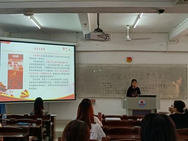 外国语学院学生第三党支部第二届讲党课比赛拉开帷幕,党员戚明悦和黄燕婷为我们展示了主题为“唤回伟大精神,做好时代答卷”的党课。由最近新上映的电影《长津湖》引入到抗美援朝战争,讲述抗美援朝战争精神,以视频形式向我们展示抗美援朝战争中的两位英雄人物邱少云和杨根思。10月19日恰逢中国人民志愿军奔赴抗美援朝战场作战71周年纪念日。她们指出,进入新时代,作为青年大学生的我们要不忘伟大抗美援朝精神,牢记历史,不忘初心和使命,在新时期做好时代交给我们的答卷。