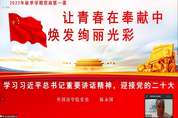 9月28日晚,外国语学院党委书记陈永国为2022级新生开讲秋季思政第一课,出席会议的有2022级辅导员陈秋湛以及2022级全体同学。