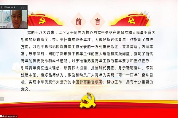 陈永国与同学们一起学习习近平总书记关于青年工作的重要论述,围绕四个方面进行了详细解读,引发青年学子思考。一青年是整个社会力量中最积极、最有生气的力量,国家的希望在青年,民族的未来在青年;二青年理想远大、信念坚定,是一个国家、一个民族无坚不摧的前进动力;三广大青年要把正确的道德认知、自觉的道德养成、积极的道德实践紧密结合起来,自觉树立和践行社会主义核心价值观;四学习中增长知识、锤炼品格,在工作中增长才干、练就本领,以真才实学服务人民,以创新创造贡献国家。