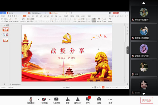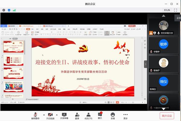 2020年7月1日上午9时,外国语学院党支部在线上举办以“迎接党的生日、讲战疫故事、悟初心使命”为主题的党日活动。出席本次活动的有第一党支部书记张勤涛老师,第二党支部书记罗成燕老师以及外语院第一、第二、第三党支部全体党员。本次活动由陈韵桥老师主持。
