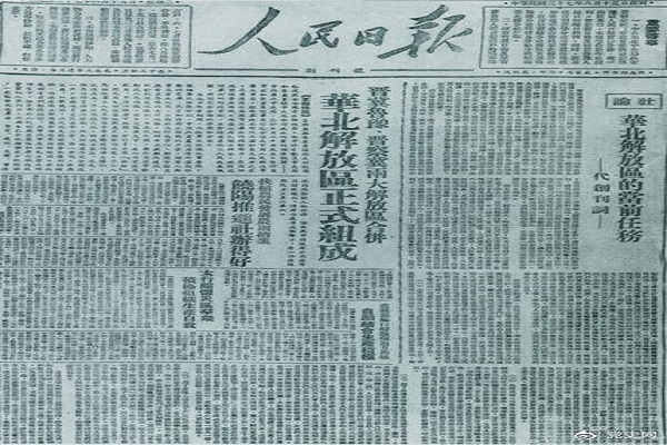 由《晋察冀日报》和晋冀鲁豫《人民日报》合并而成的中共华北局机关报《人民日报》在河北省平山县里庄创刊,毛泽东为《人民日报》题写报头。1949年3月15日,人民日报社迁入北平。同年8月1日,中共中央决定将《人民日报》转为中国共产党中央委员会机关报,并沿用1948年6月15日的期号。