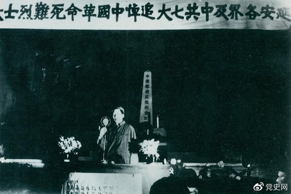 毛泽东在中国革命死难烈士追悼大会上担任主祭,并发表演说。演说指出:今天中国共产党第七次全国代表大会的代表和延安人民的代表联合在这里开一个追悼大会,追悼几十年来中国革命队伍在各个战线上所牺牲的人。这些牺牲者,有几十万的共产党员、成百万的革命民主主义者。我们开了第七次全国代表大会,中国共产党制定了一套建立一个独立、自由、民主、统一、富强的新中国的路线、纲领、政策。这是亿万中国人民在他们的先锋队中国共产党的领导下,几十年奋斗的结果。中国有两大敌人、两座大山压迫我们四万万五千万人民,一座大山就是帝国主义,另一座大山就是封建主义。正是帝国主义和封建主义束缚了中国人民的生产力,不破坏它们,中国就不能发展和进步,中国就有灭亡的危险。革命是干什么呢?就是要冲破这个压力,解放中国人民的生产力,解放中国人民,使他们得到自由。所以,首先就应该求得国家的独立,其次是民主。没有这两个东西,中国是不能统一和不能富强的。
