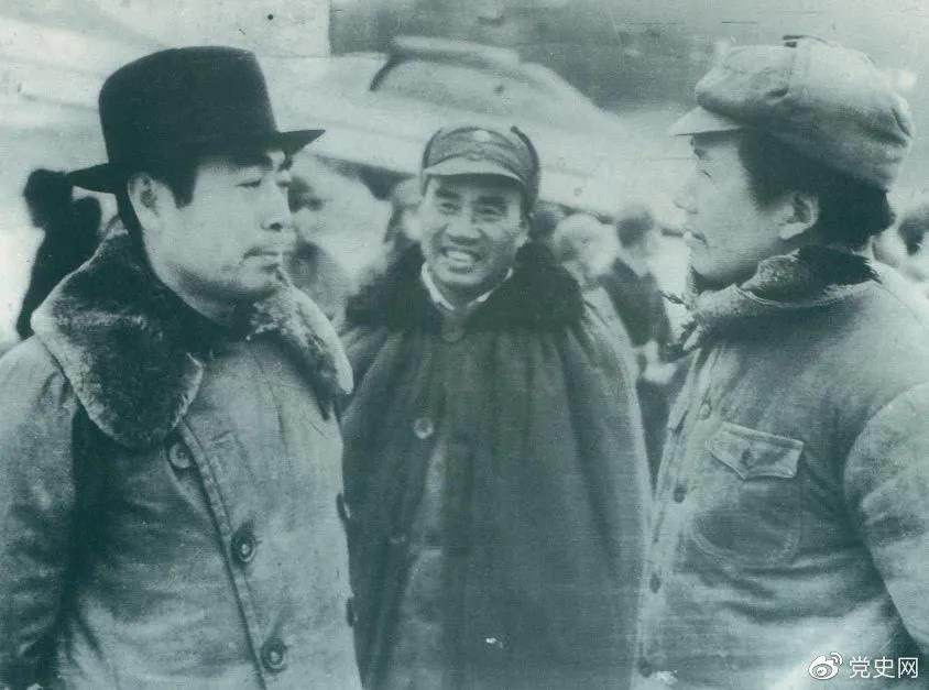 1945年11月11日,毛泽东、朱德赴延安机场迎接从重庆回来的周恩来。