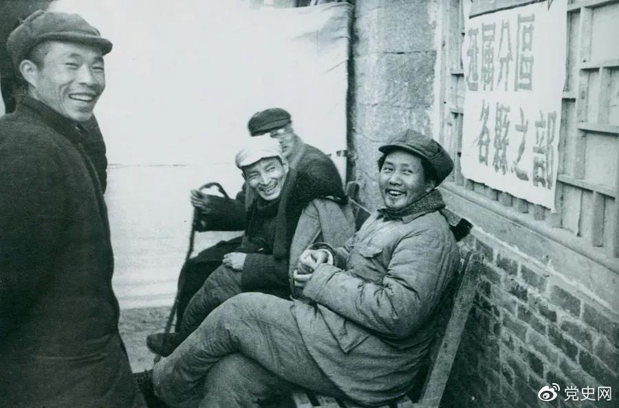 1943年12月,毛泽东和陈云、林伯渠参观陕甘宁边区第三届生产展览会。