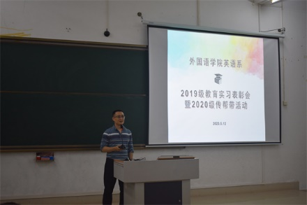 5月12日晚,外国语学院在教三611举行了2019级教育实习表彰会暨2020级“传帮带”活动。参会人员有外国语学院党委杨建伟副书记、英语系主任古永辉、唐汉娟老师、刘晓玲老师、陈益莲老师以及外国语学院19、20级的学生,会议全程由古永辉主持。