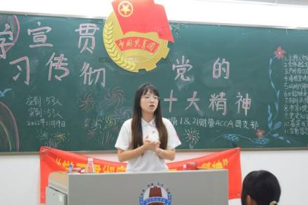 11月19日晚上,外国语学院“培根”宣讲团在教五A214室开展了以“做有理想、有使命担当的青年”为主题的宣讲会。本次会议由21级英语4班王培贤主讲,21级财管1班与21级财管ACCA创新班全体同学参与了此次宣讲。