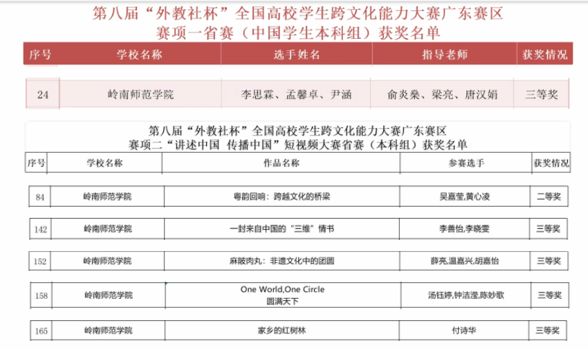回顾此次大赛,学校参赛学子在备赛过程中,深入学习跨文化知识,反复打磨参赛内容。在跨文化能力赛项中,他们不断提升对不同文化的认知与阐释能力;在短视频赛项里,他们用心挖掘中国故事。学子们的努力与付出,不仅是对自身跨文化素养的提升,也展现了岭师学子积极向上、追求卓越的精神风貌。