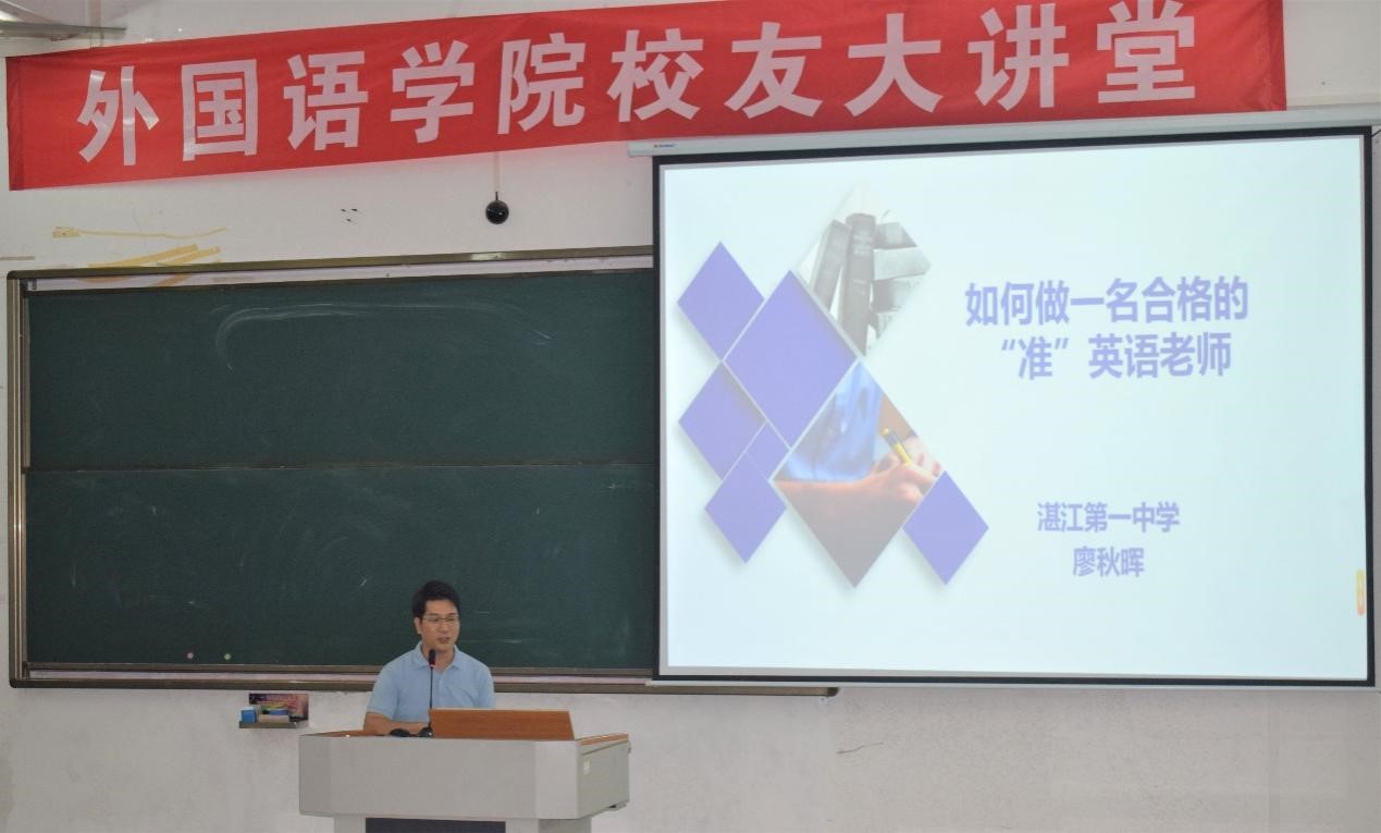 6月19日晚,外国语学院在教三611开展“名师进校园”校友大讲堂活动,邀请优秀校友现湛江一中名师廖秋晖老师以及湛江市第八小学王海洵副校长为2019级英语专业同学们开讲。