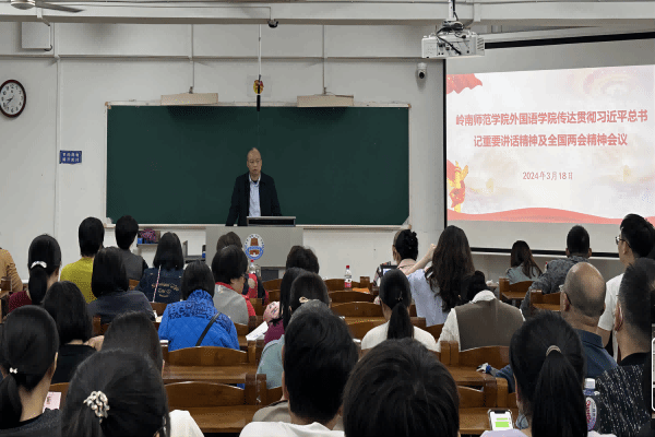 3月18日晚,外国语学院在教三405召开传达贯彻习近平总书记重要讲话精神及全国两会精神会议,发展新质生产力,推动高质量发展。出席本次会议的有外国语学院全体教职工、班长和团支书。主持本次会议的是外国语学院党委书记陈永国。