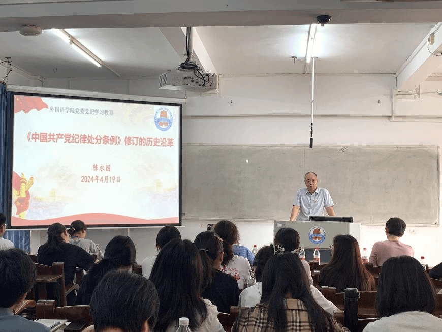 4月19日,外国语学院在第三教学楼908室召开党纪学习教育会。本次会议旨在深入学习《中国共产党纪律处分条例》,提高全体党员的纪律意识和规矩意识,推动全面从严治党向纵深发展。外国语学院全体师生党员参会,学院党委书记陈永国主持会议并开讲党课。
