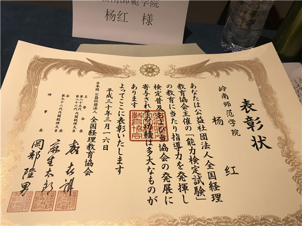 3月16日,我院副院长日语系主任杨红教授应邀参加了在大连举行的日本全经协会研修及表彰大会,日语系与日本友好学校松本大学联合办学,每年定期邀请该校经济学教授为日语系学生开设了簿记3级、2级课程及社会人常识礼仪课程,然后参加日本全经协会的上述资格考试,2016年日语系13级46名学生首次参加簿记3级考试,达到了100%的通过率;14级首次参加簿记2级资格考试,达到了75%的通过率;社会人常识礼仪2级达到了91%的通过率,大大提高了学生的就业率。国际合作办学独具特色、通过率之高、考试种类之多、在华南地区首次开设上述考场等,都彰显了日语专业的国际化办学特色,成效显著,影响深远。