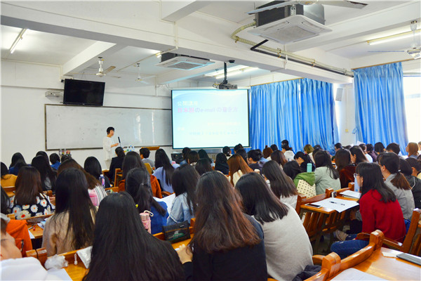 然后,进入了本次讲座的主题,中村副教授首先阐述了信息化社会电子邮件的重要性,认为电子邮件对于语言表达、工作、人际关系及社会生活等方面都具有重大意义。中村副教授举例详细地说明了日语邮件的写法,指出在不同场合电子邮件的不同写法。包括给老师、朋友、上司、客户等如何正确地发送邮件,特别针对收件人称谓、署名、开头的自我介绍、寒暄、事情经过和邮件的目的等方面,进行了详细讲解,指出在商务文书、邮件、微信、脸书等各种场合如何对上司、长辈、客户使用敬语、如何得体地表达、有哪些固定表达方式及注意事项,对如何适应信息化社会提出建议及解决策略。