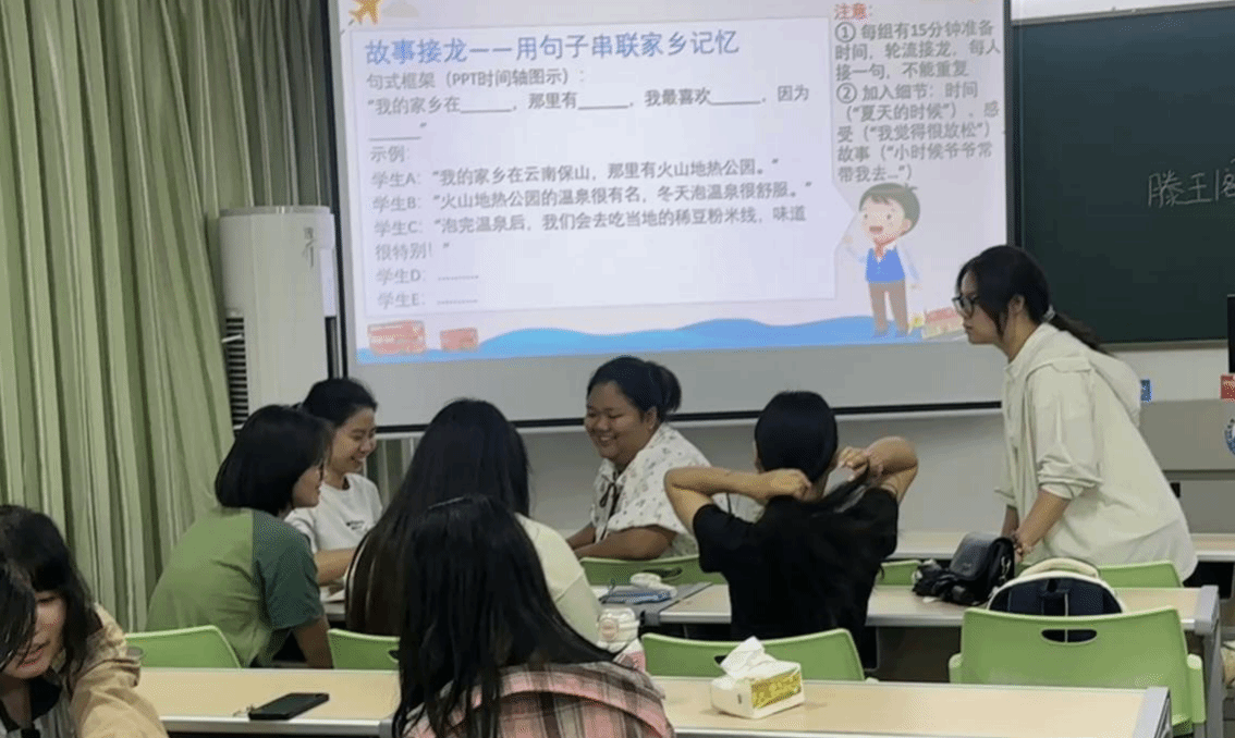 第二周“我的家乡”主题课程,李佩君和邓秋铃两位小老师带领同学们开启了一场充满温情的文化之旅。商务英语专业志愿者们与留学生们再次紧密互动。小组交流环节,大家热情分享家乡的美景、美食和背后的动人故事。通过模拟中国文化节、泰国美食节等场景,让学生们切实感受到不同文化的独特魅力。“家乡版‘你画我猜’”游戏更是将课堂氛围推向高潮,大家在欢乐中加深了对彼此家乡的认识。志愿者与留学生相互配合,用生动的绘画和巧妙的提问,让游戏充满趣味,在欢声笑语中增进了友谊。