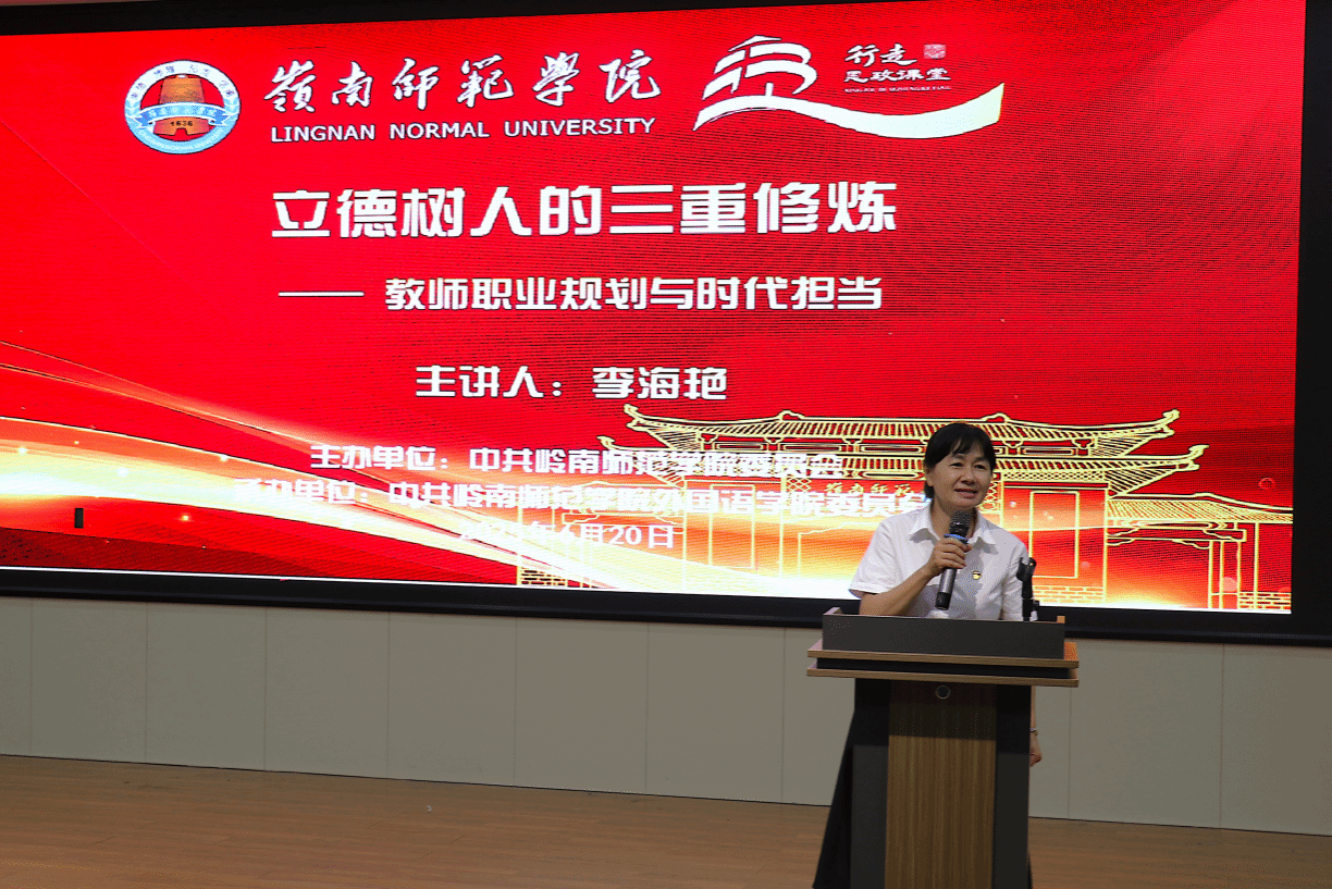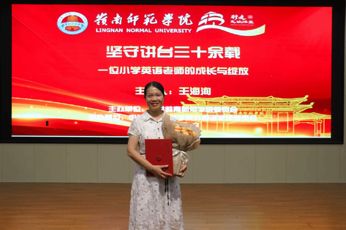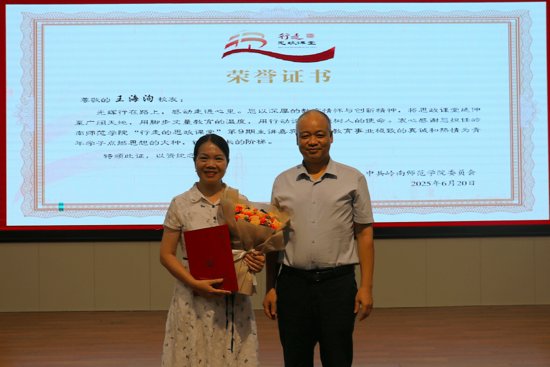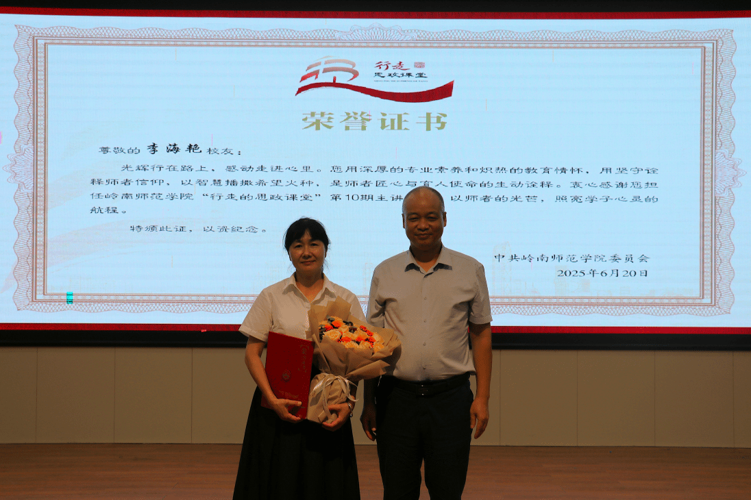 为推动思政教育与专业引领相融合,充分发挥优秀校友的示范带动作用,让师范生深入汲取优秀教师成长经验,6月20日,外国语学院邀请湛江市第二十四小学党委书记、校长、1999届校友王海洵,遂溪县第一中学学科组长、1995届校友李海艳担任主讲嘉宾,在寸金校区第三教学楼511举办2025年第9-10期“行走的思政课堂”活动,外国语学院党委书记陈永国、辅导员黄日新以及近300名学生代表参会。