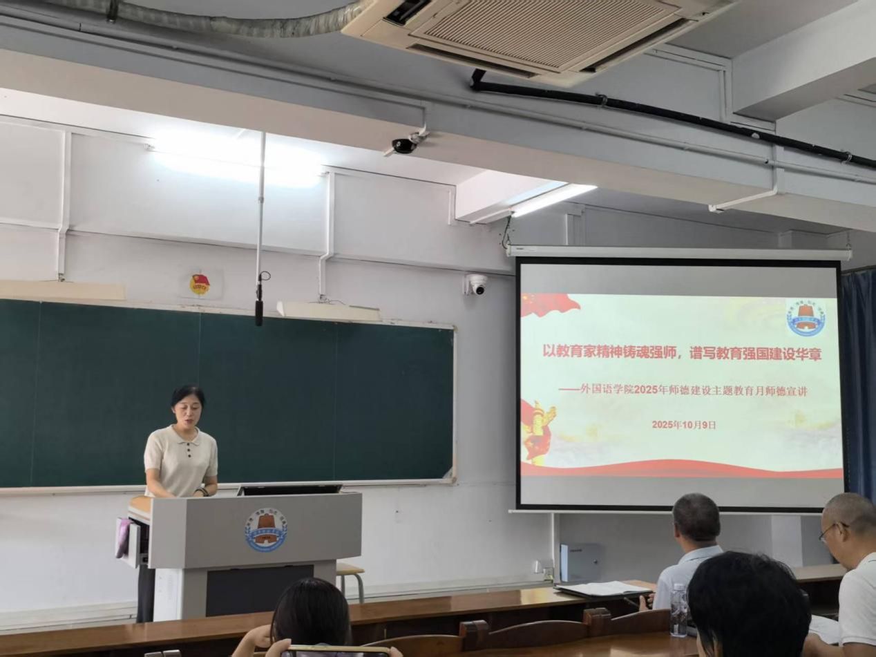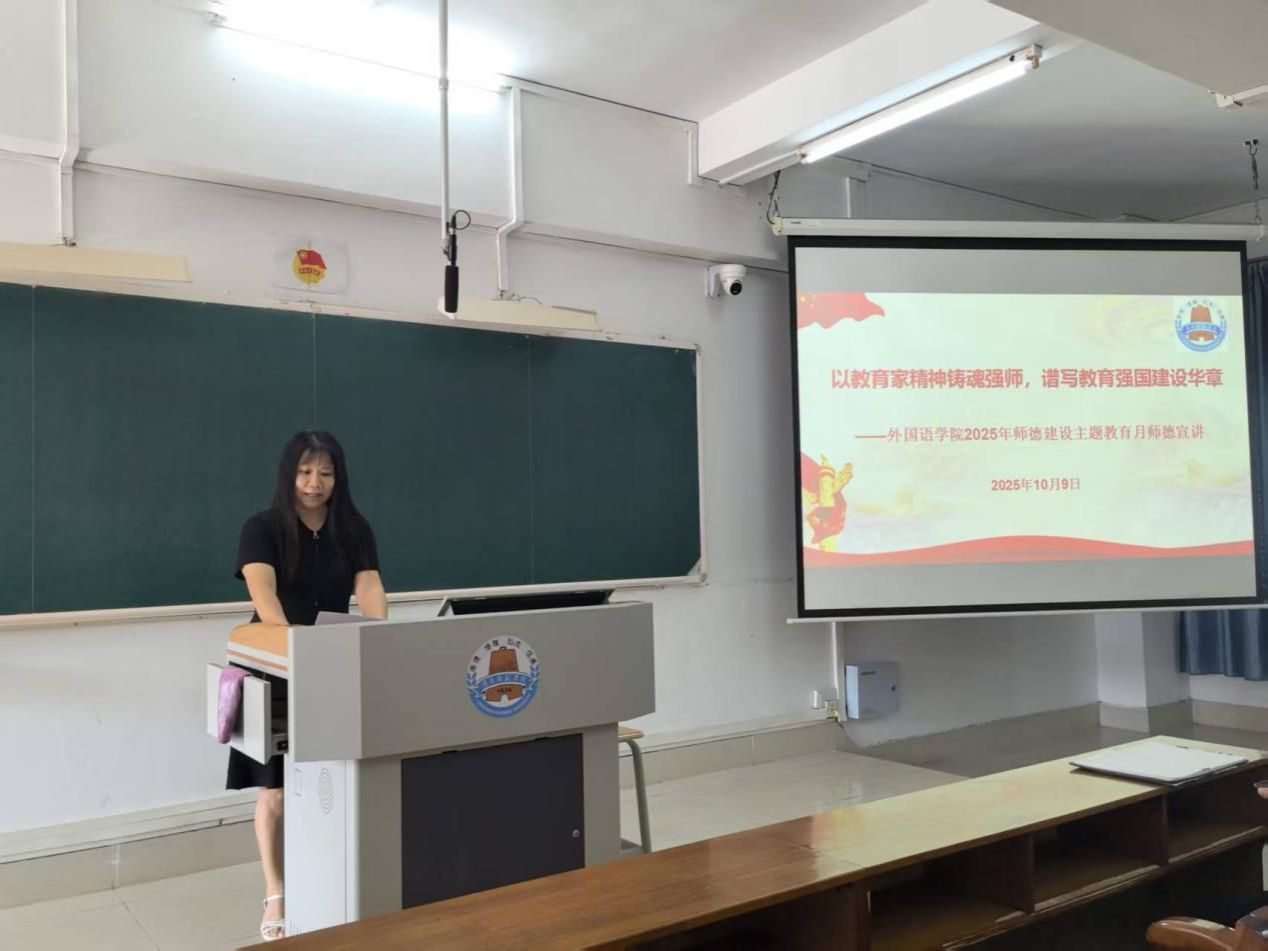 为进一步强化师德师风建设,凝聚立德树人的教育共识,10月10日,外国语学院在第三教学楼405教室举办师德建设主题教育月师德宣讲大会。本次大会由外国语学院党委书记陈永国主持,学院全体教职工参会。