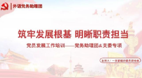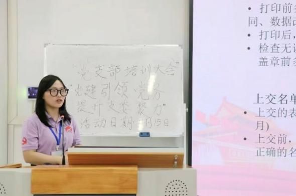 在这之后,校党建组织部钟晓婷详细阐述了入党培养登记表、入党志愿书等党籍材料的规范填写要求,同时对党员发展各阶段的时间节点相关要点进行了深入剖析,为支部党籍材料管理以及党员发展工作的有序推进提供了清晰指引。