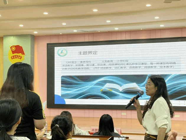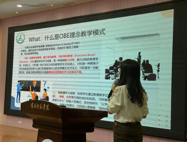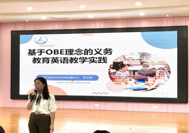 在课例的沉浸式体验之后,劳老师顺势引出背后的理论支撑——OBE(成果导向教育)理念,清晰阐释其“成果导向、逆向设计、以学定教”的核心内涵。她深入浅出地阐释,OBE的核心在于“以终为始”,即教学设计和评价都必须紧紧围绕学生“最终能做什么”这一成果目标。这与新课标所强调的培养学生语言能力、文化意识、思维品质和学习能力四大核心素养完全契合。她强调,教师要从“教材的执行者”转变为“学生素养发展的设计师”,课堂教学必须实现从“教师中心”到“学生中心”的根本转变,让学习真实发生。