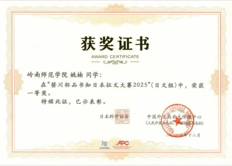 姚楠同学的获奖作品围绕中日文化交流主题,以细腻的笔触和独到的见解展现了阅读书籍后的深刻感悟,体现了良好的日语表达能力与跨文化思考能力。该成绩的取得,既是学生个人勤奋钻研的结果,也离不开指导老师的精心辅导和学院对日语学科建设的高度重视。获奖者将受邀赴日参加为期数日的文化研修,进一步加深对日本社会与文化的理解。