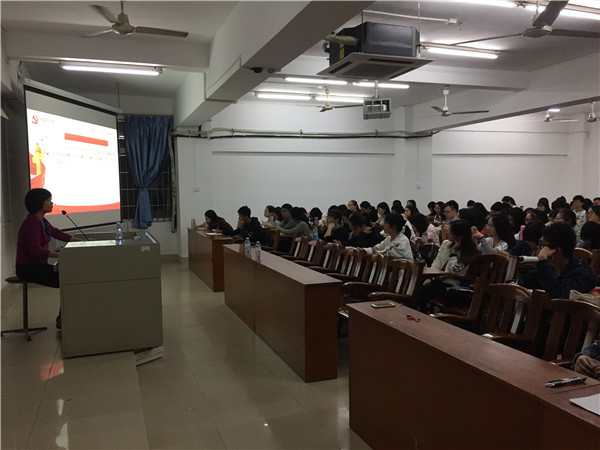为提高同学们对十九大报告的认识,外国语学院于2017年11月19日晚在教三405教室成功举行“学习贯彻党的十九大精神”讲座,本次讲座由马克思主义学院洪小瑛副教授主讲,外国语学院党委梁煜鹏副书记、辅导员陈韵桥老师及全体学生党员、入党积极分子、团支书,学生会、团委及社联干部聆听了讲座。