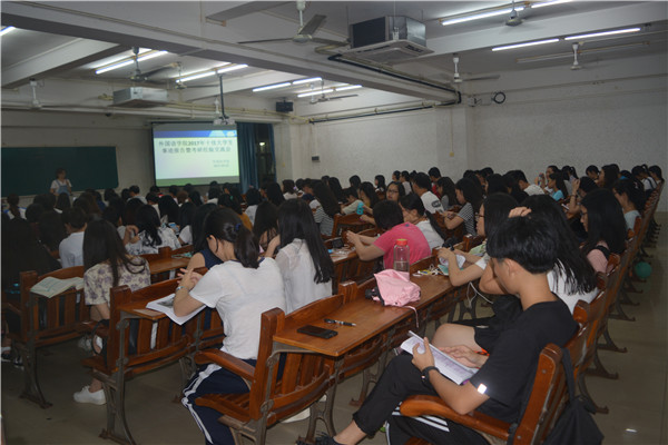 随后依次是五位考取研究生的学长、学姐分享自身奋斗故事。考取英国诺丁汉大学的黄一豆向同学们介绍了有关考研的注意事项,提醒同学们要重视绩点,实践经历和荣誉证书。被广州大学学科英语专业录取的黄洁萍认为考研切勿心浮气躁,三心二意,要多参加与专业相关的实践活动。被香港浸会大学教育学专业录取的钟土梅讲述了自己的考研经历,告诉同学们,考研要备战雅思,努力学习,排除万难,坚定梦想,直至成功。考取了英国利兹大学对外英语教学专业的易晓静师姐向同学们传授备战雅思的技巧,认为要练好口语,就要多积累高级词汇以及句法,阅读方面要制定相应的计划,多背单词,常看错题本。最后是被暨南大学文化创意与文化产业录取的李明琪,他分享了从决定跨专业考研到考研成功,在短短三个月左右,历经坎坷,努力拼搏,终于实现自己的梦想的动人故事,用他的成功鼓励同学们要有个远大的目标,并且无论如何都要坚持下去。