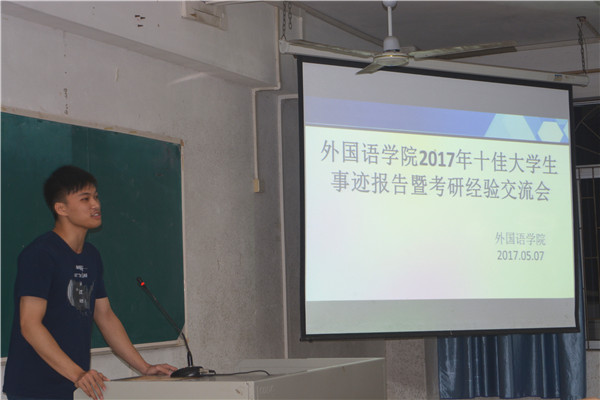5月7日晚,外国语学院在弘雷楼205教室成功开展了2017年十佳大学生事迹报告暨考研经验交流会,目的是发挥“十佳大学生”和学院考研先进学长的榜样力量,引导同学们学习榜样、赶超榜样,提升自我。此次交流会的主讲嘉宾是2017年十佳大学生陈海波及我院考研先进学长(姐)黄一豆、钟土梅、李明琪、黄洁萍、易晓静,学院党委梁煜鹏副书记、辅导员杨进军老师、2016级同学及有考研意愿的同学参加了交流会。