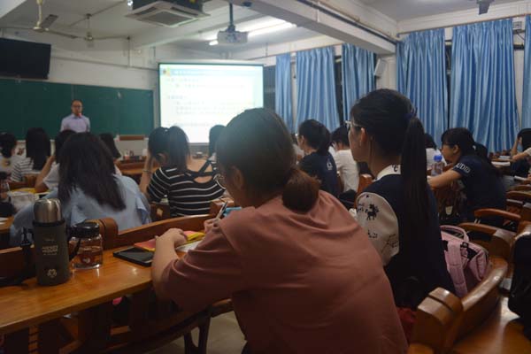 讲座伊始,周庭华博士详细介绍了五邑大学的发展历史、地理位置,以及在校学生情况、师资情况,让在场的同学们对五邑大学有了更加深刻的认识。五邑大学外国语学院不仅有一支年龄结构合理、教师经验丰富的师资队伍,还有着学科教育(英语)专业硕士学位点。周庭华博士向在场的学生介绍了该校对研究生提供的生活条件、学习条件、师资条件,同时,他表明:五邑大学欢迎大家报考五邑大学硕士研究生。