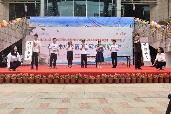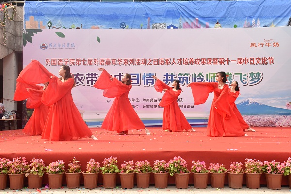 本次活动分为文艺表演及模拟摊位两部分。主持人介绍出席嘉宾后,由杨红副院长致开幕词。杨红副院长简单介绍了中日文化节的发展历程与活动定位,并对参加活动的嘉宾和学生表示热烈欢迎。此后文艺表演正式开始。首先表演的是独唱《中国圆舞曲》、富有“宅文化”特色的舞蹈《恋爱循环》及元气满满的日语歌曲《世界上唯一的花》,紧接着是乐器合奏的《风居住的街道》、民族舞蹈《傣雨》及话剧表演《日语系那些不得不说的事》。