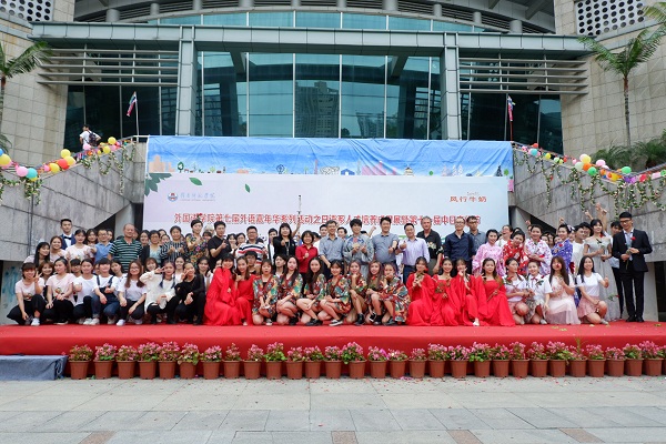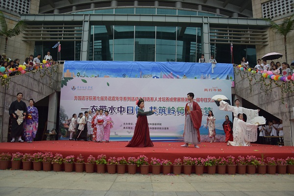 4月22日下午3点,由外国语学院主办,日语系承办的“一衣带水中日情,共筑岭师腾飞梦”——外国语学院第七届外语嘉年华系列活动之日语系人才培养成果展暨第十一届中日文化节在新区体育馆前举行。国际交流处郑志军处长、教务处莫海文副处长,外国语学院党委冯彩莲书记、孙卫东院长、杨红副院长、周红辉副院长、梁煜鹏副书记以及外国语学院各专业的老师和同学们出席活动,同时也吸引了许多对其感兴趣的人士前来观看。