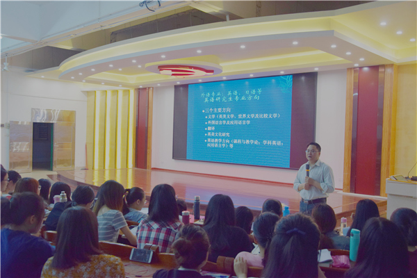 为打造新学工,推动学生考研工作,力促人生提升,2018年4月27日,外语院举办外语专业考研专题辅导讲座。本次讲座由教务处副处长莫海文教授主讲,外语院2015级全体学生参加。