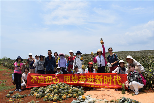 首先,全体女教职工来到了徐闻曲界镇,走进著名的菠萝的海,体会迷人壮美的热带特色农业,在现场参观菠萝的采摘流程,向当地果农了解今年菠萝的种植规模、销售状况,了解菠萝生产作为当地特色农业的实际运营情况。