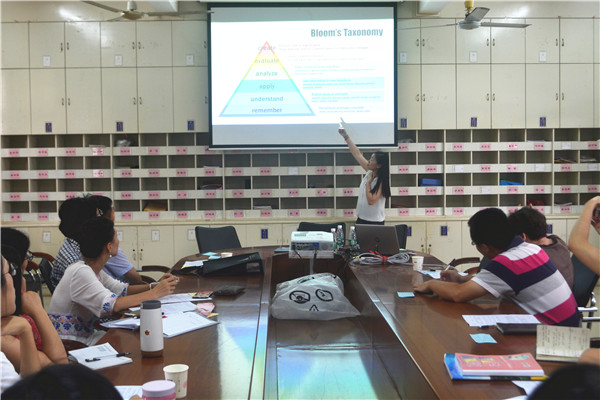 为了进一步促进教师队伍的成长,提升人才培养质量,外国语学院邀请了我校知名校友现任美国威斯康辛大学欧克莱尔分校外语系的助理教授孔凯珊博士为教师们开展了题为“反思性教学法UbD教学法在英语教学的应用”的研讨会。研讨会于5月28号下午4点,在第三教学楼会议室举行,外国语学院以及湛江一中培才学校的老师们参与本次研讨会。