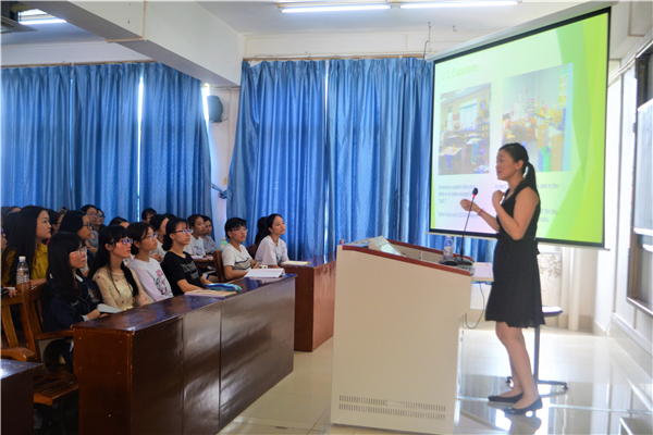 讲座伊始,孔博士就“中国人对美国有哪些刻板印象”问题,让现场同学展开讨论,同学们热情高涨,谈论了美国饮食,学校教育,考试制度等等。接着孔博士就其在美国的教学经历,给同学们列举了美国学生对中国教育的刻板印象,比如他们认为:中国学生擅长数学、教育制度等同考试,以教师为中心等。为了打破这些刻板印象,孔博士讲述中国与美国学校教育的不同之处以及可以学习的方面。首先,在美国,年满18岁的学生更注重独立生活,靠兼职来提供自己的经济来源。他们有自己的隐私权,父母不可以私下询问老师孩子的学习情况。他们可以在选择专业时有更广泛的了解和选择,并且他们可以与老师平等交流甚至挑战老师。而在中国,大多数学生尊师重道,有既定的学习目标,在进入大学前已选好专业,听从老师父母的安排等。在学习借鉴方面,孔博士认为中国可以向美国学习创新思维,给学生提供多样的教育资源,学习不同的教学方式;美国则可以向中国学习:教师要注重学生的基础知识,学生应更加尊重老师,不要过于以自我为中心。